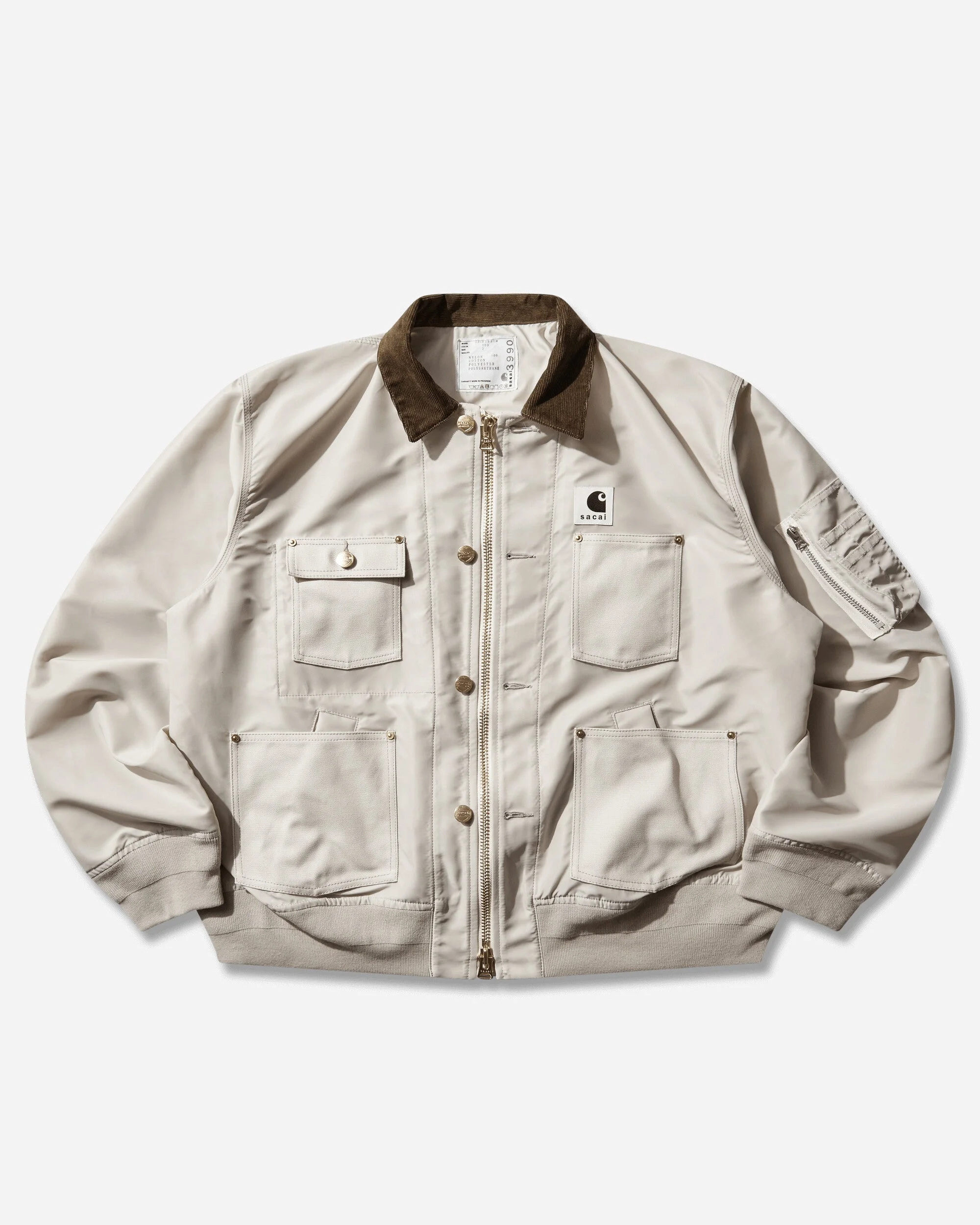 sacai x Carhartt WIP Nylon Twill x Duck Blouson Ivory sacai and Carhartt WIP return for their fourth capsule collaboration. The sacai x Carhartt WIP Nylon Twill Duck Blouson combines the silhouette of sacai’s MA-1 blouson jacket with elements of Carhartt WIP’s Chore Coat. The item is made from sacai’s nylon twill fabric, and features four Dearborn Canvas pockets and a corduroy collar. The front features two closures: a button fastening referencing the Chore Coat, and a zip closure, which draws from sacai’s MA-1 blouson. - 100% Nylon - Loose Fit - Corduroy Collar - Two-Way Zip Closure - Four Front Pockets - Co-Branded Woven Square Label - Utility Zip Pocket at Sleeve - Ribbed Cuffs and Hem - Made in Japan - Style Code: 26-03990M 001