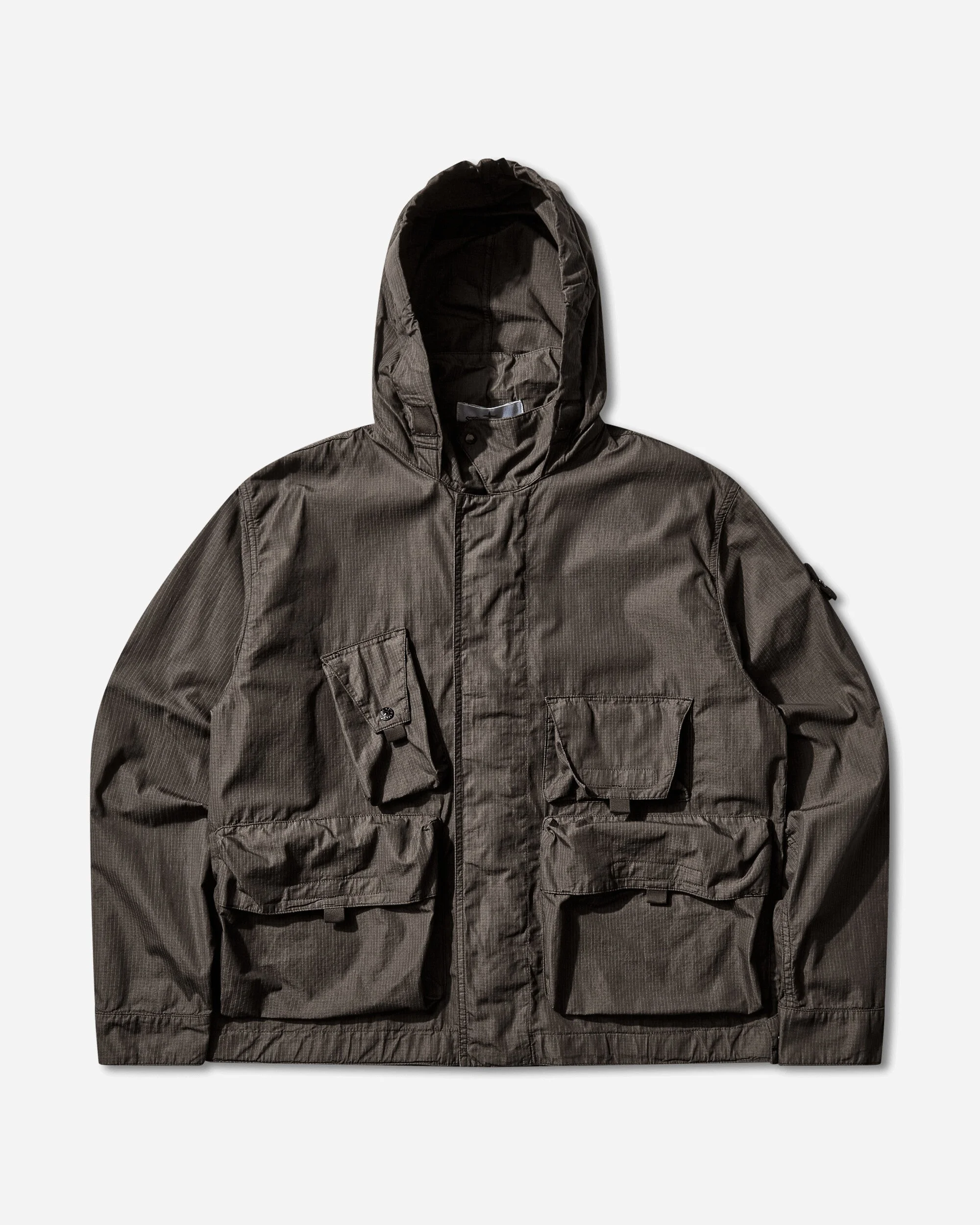 Stone Island Cotton Nylon Micro Ripstop Field Jacket Charcoal Field jacket in lightweight cotton nylon ripstop featuring a foldaway hood, multiple pockets, adjustable cuffs, a drawstring hem, and concealed two-way zip. Garment dyed with anti-drop. - 79% Cotton, 21% Polyamide - Garment Dyed - Anti-Drop Finish - Regular Fit - Packable Drawstring Hood - Concealed Two-Way Zip Closure - Four Front Pockets - Interior Pocket - Stone Island Badge at Sleeve - Drawstring Hem - Made in Italy - Style Code: L1S154100071S0318 V0065