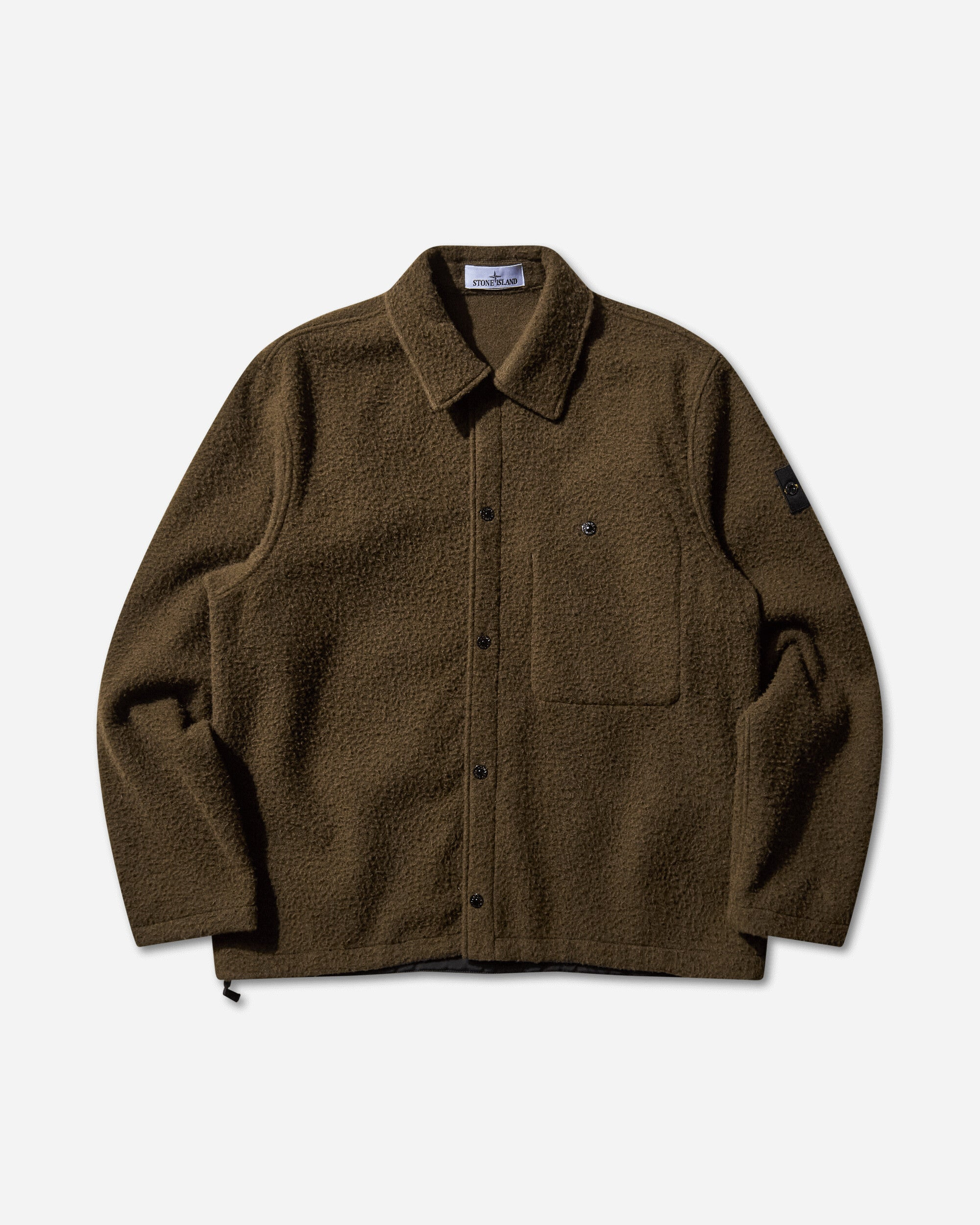 Stone Island Panno Ratinato Overshirt Military Green Overshirt in wool nylon finished with ratteen process creating a knotted appearance, featuring internal chest pocket, adjustable cuffs, and snap fastening. - 80% Virgin Wool, 20% Polyamide - Regualr Fit - Nylon Twill Undercollar - Snap-Button Closure - Inner Chest Snap Pocket - Stone Island Badge at Sleeve - Adjustable Cuffs - Style Code: K2S15-1200021-S0214 V0054