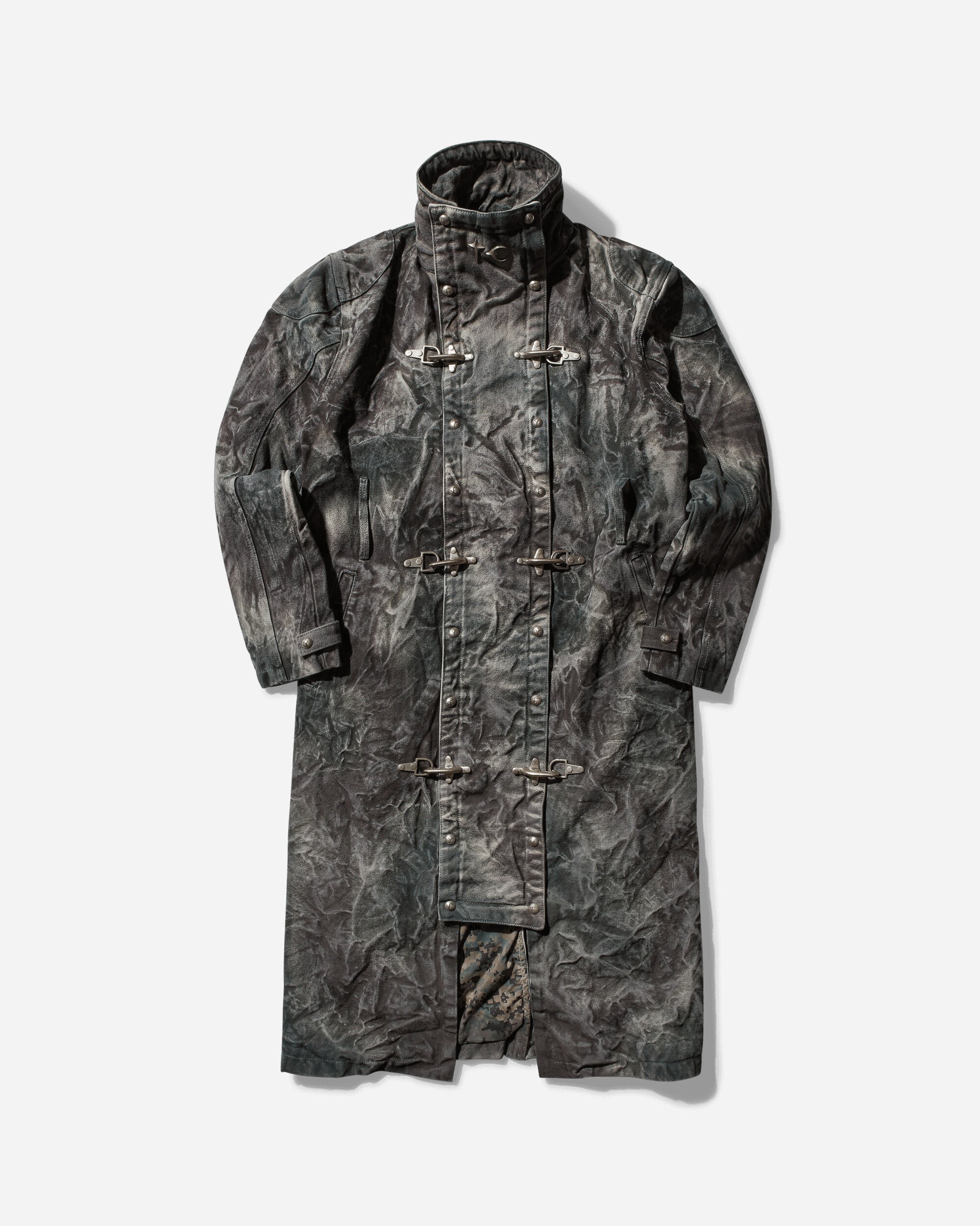 Thug Club Bio Soldier Denim Trench Coat Camo Founded in 2018 by Yeong Min Cho, THUG CLUB has quickly become a key player in the South Korean fashion scene. Initially driven by Cho's existing influence, the brand reached new heights when Jiyool Kwon joined as design director. Together they created a distinctive, subversive streetwear aesthetic that fuses hip-hop culture with Americana motorcycle influences. THUG CLUB's collections are a bold expression of the irreverence and fearless self-expression. - 100% Cotton - Lining: 100% Polyester - Regular Fit - Stand-Up Collar - Emblem at Front - Hook Closure - Two Front Pockets - Adjustable Cuffs - Single Vent at Back - Made in South Korea - Style Code: TC24CT0203 CAMO