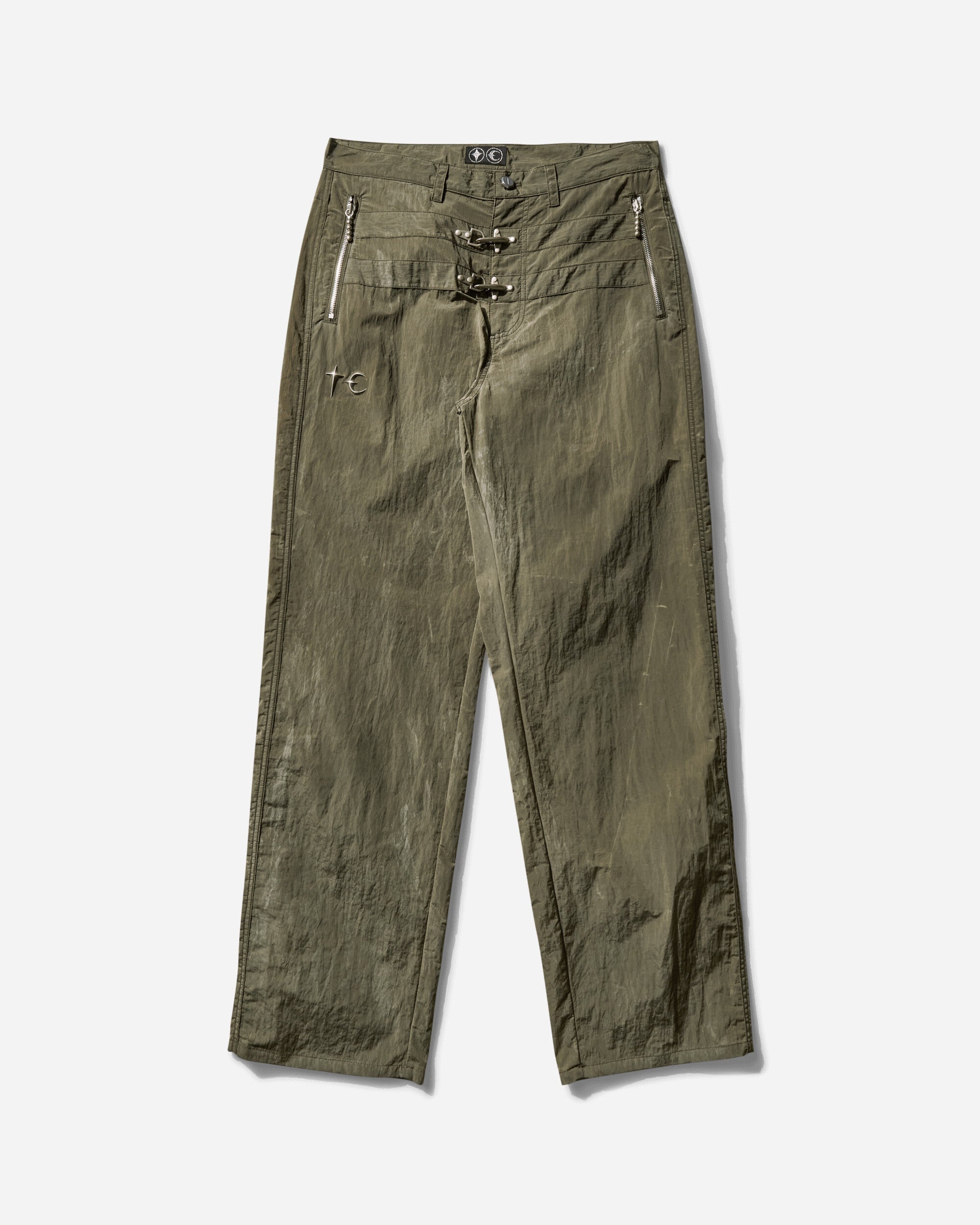 Thug Club Scarred Bio Soldier Pants Khaki Founded in 2018 by Yeong Min Cho, THUG CLUB has quickly become a key player in the South Korean fashion scene. Initially driven by Cho's existing influence, the brand reached new heights when Jiyool Kwon joined as design director. Together they created a distinctive, subversive streetwear aesthetic that fuses hip-hop culture with Americana motorcycle influences. THUG CLUB's collections are a bold expression of the irreverence and fearless self-expression. - 100% Re-Nylon - Scarred Nylon Fabric - Regular Fit - Custom Buttons and Rivets - Toggle Button Detail - Two Front Zip Pockets - Emblem at Front - Two Back Pockets - Made in South Korea - Style Code: TC25PT0401 KHAKI