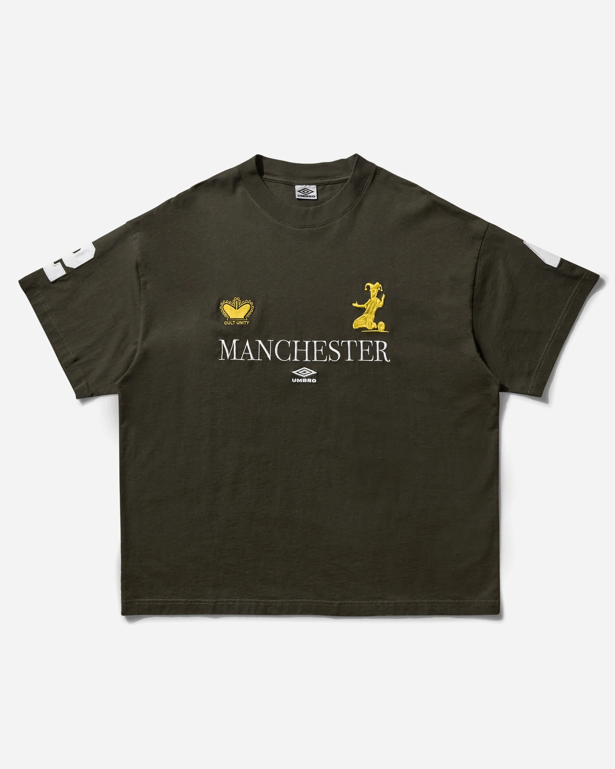 Umbro Manchester T-Shirt Dark Olive For Autumn/Winter 2025, long-term partners Slam Jam and Umbro unveil a bold new collection, seamlessly blending the distinguished tailoring traditions of Britain and Italy with the dynamic energy of sportswear. “Cult Unity” serves as the defining motif, celebrating the fusion of these two iconic cultures. - 100% Cotton - Boxy Fit - Ribbed Collar - Embroidered Graphic at Chest - Style Code: UBMW0397JY121 GRN0010