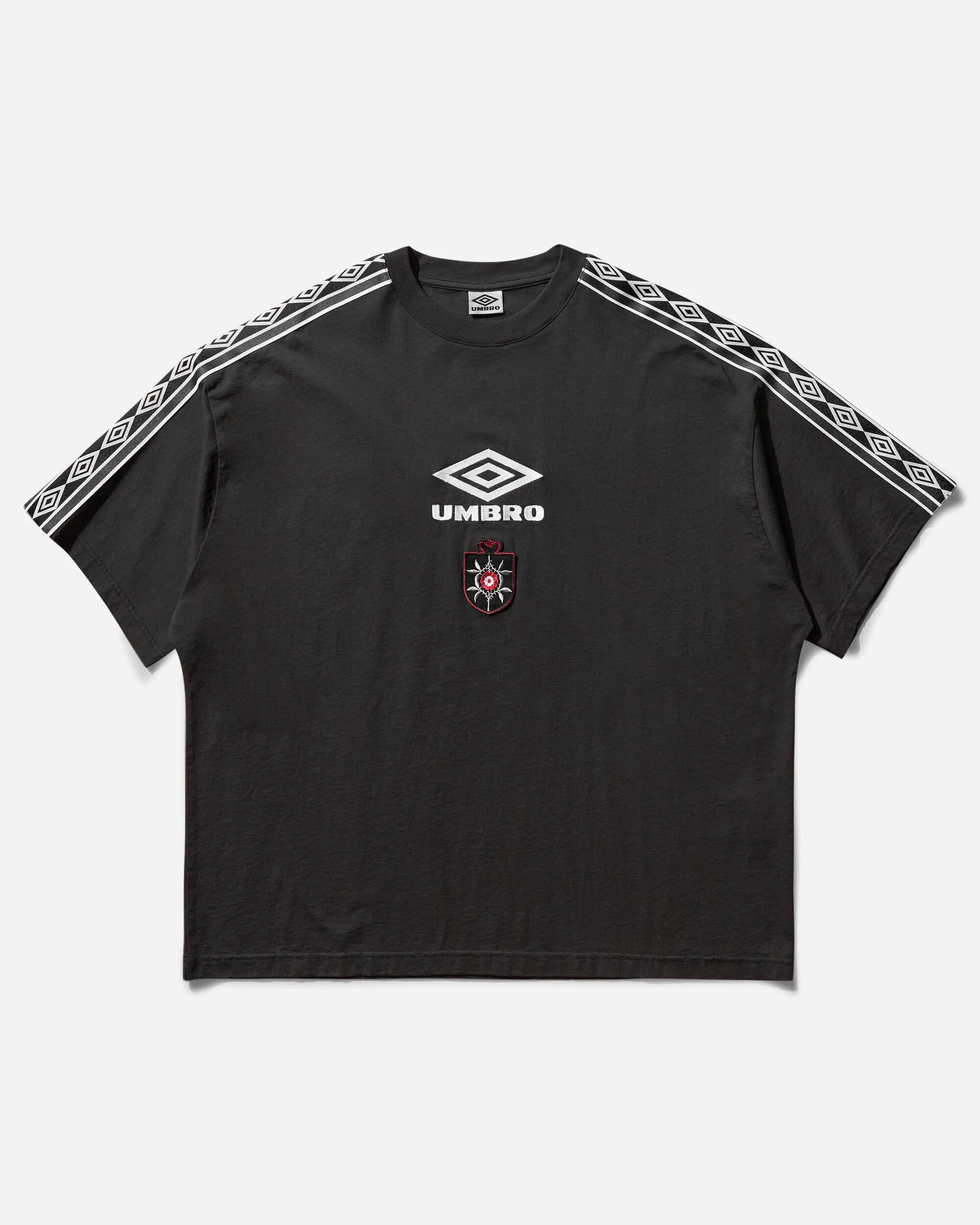 Umbro OG Tape T-Shirt Washed Black For Autumn/Winter 2025, long-term partners Slam Jam and Umbro unveil a bold new collection, seamlessly blending the distinguished tailoring traditions of Britain and Italy with the dynamic energy of sportswear. “Cult Unity” serves as the defining motif, celebrating the fusion of these two iconic cultures. - 100% Cotton - Boxy Fit - Ribbed Collar - Contrasting Logo Tape - Embroidered Logo at Chest - Rose Crest Patch - Style Code: UBMW0341JY101 BLK0020
