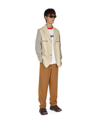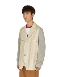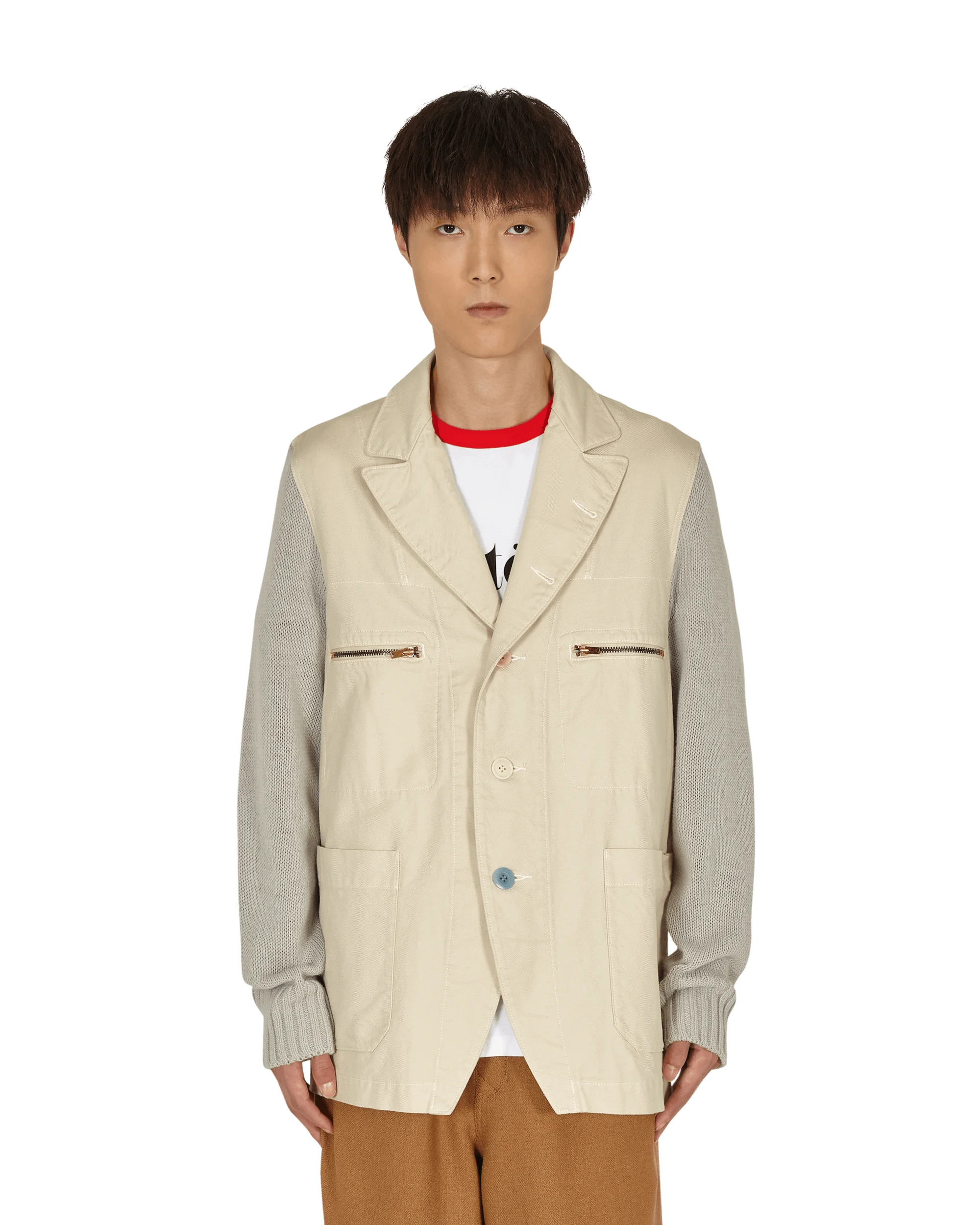 Undercover Cotton Blazer Ivory - 100% Cotton - Notched Lapel Collar - Flap Mismatched Buttons Closure - Two Zipped Chest Pockets - Two Waist Pockets - Contrasting Sleeves - Ribbed Cuffs - Adjustable Back Tab - Made in Japan - Style Code: UC1A4105 IVORY SIZE & FIT Model is 6ft 1in/1.86m with 31"/81cm chest and wears size L. Measures (Size L): 48cm Shoulders, 55cm Chest, 71cm Sleeve, 77cm Length, 55cm Hem.