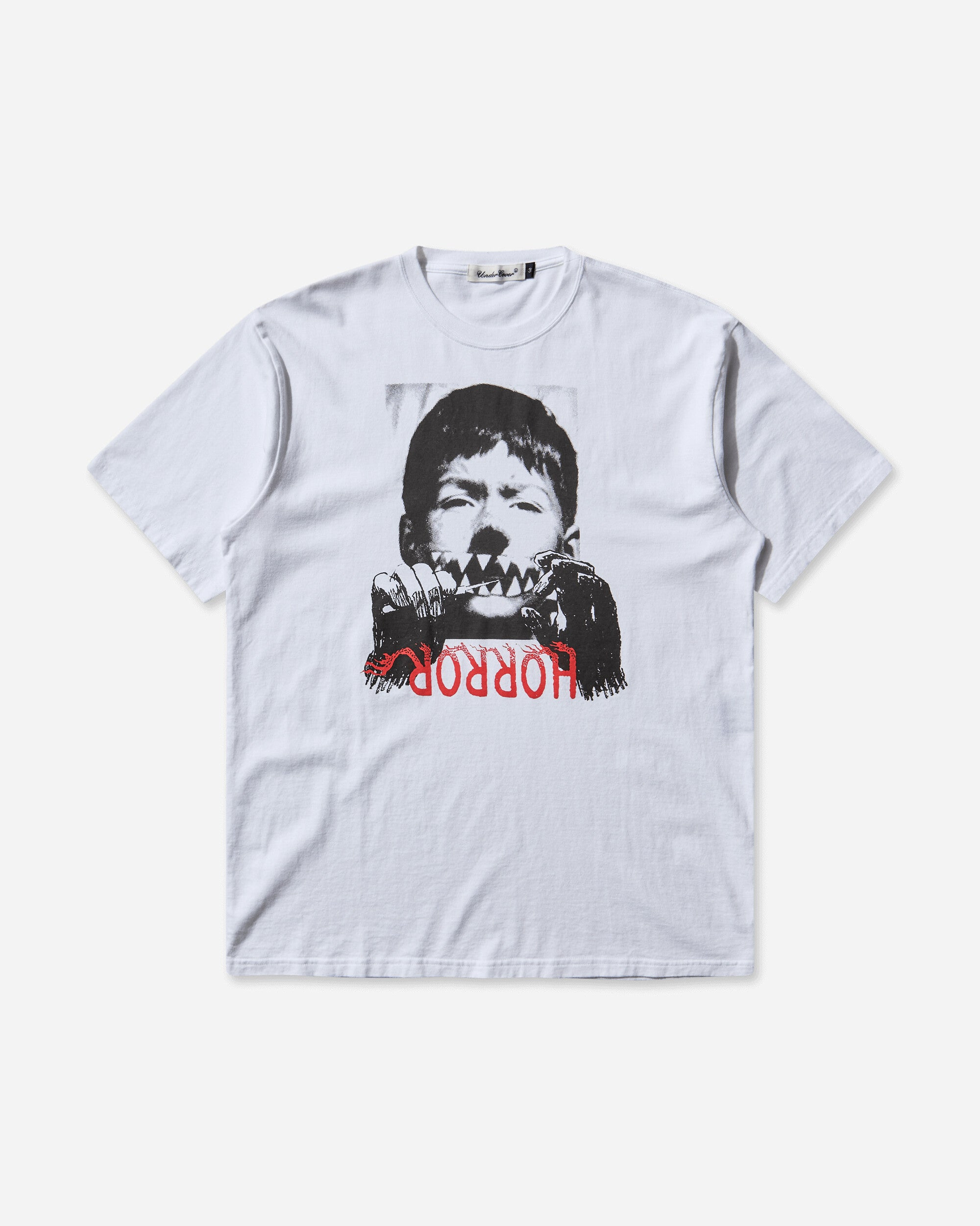 UNDERCOVER Graphic T-Shirt White Named “INTERFACE” after the 1977 album by French elect-rock band Heldon, this menswear collection delivered fresh takes on some classic Undercover themes. Regular fit t-shirt with screen-printed graphic on the front. - 100% Cotton - Regular Fit - Ribbed Collar - Graphic Printed at Front - Made in Japan - Style Code: UC2E3803 WHITE