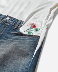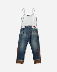 UNDERCOVER All-In-One Denim Pants Light Blue Indigo From UNDERCOVER's latest woman collection, these denim all-in-one with satin camisole feature distressed details, crimp corsage on the front and wool knit switch on sides and hem. - 100% Silk, 100% Cotton, 100% Wool - Regular Fit - Satin Camisole with Embroidery - Regular Fit - Straight Leg - Button Closure - Zip-Fly - Five-Pocket Construction - Distressed Details - Wool Knit Sides and Hem - Made in Japan - Style Code: UC2D1701 LBLI