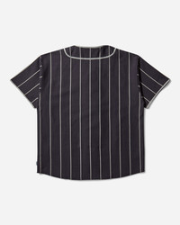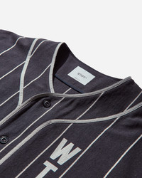 WTAPS League Baseball Shirt Navy A baseball shirt made from original striped fabric with a printed motif on the front. - 100% Cotton - Boxy Fit - Striped Pattern - Button Closure - Logo Printed at Front - Woven Logo Patch at Bottom Hem - Curved Hem - Made in Japan - Style Code: 251ATDT-CSM26 NAVY