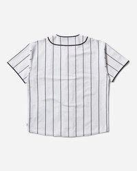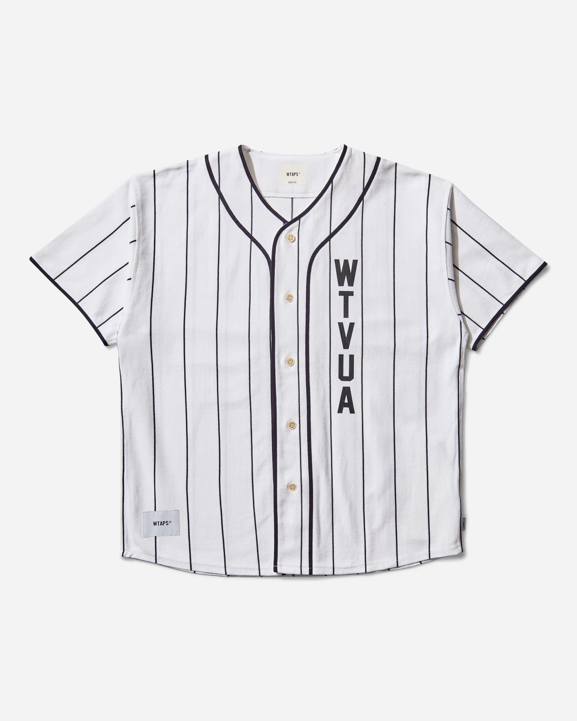 WTAPS League Baseball Shirt White A baseball shirt made from original striped fabric with a printed motif on the front. - 100% Cotton - Relaxed Fit - Striped Pattern - Button Closure - Logo Printed at Front - Woven Logo Patch at Bottom Hem - Curved Hem - Made in Japan - Style Code: 251ATDT-CSM26 WHITE