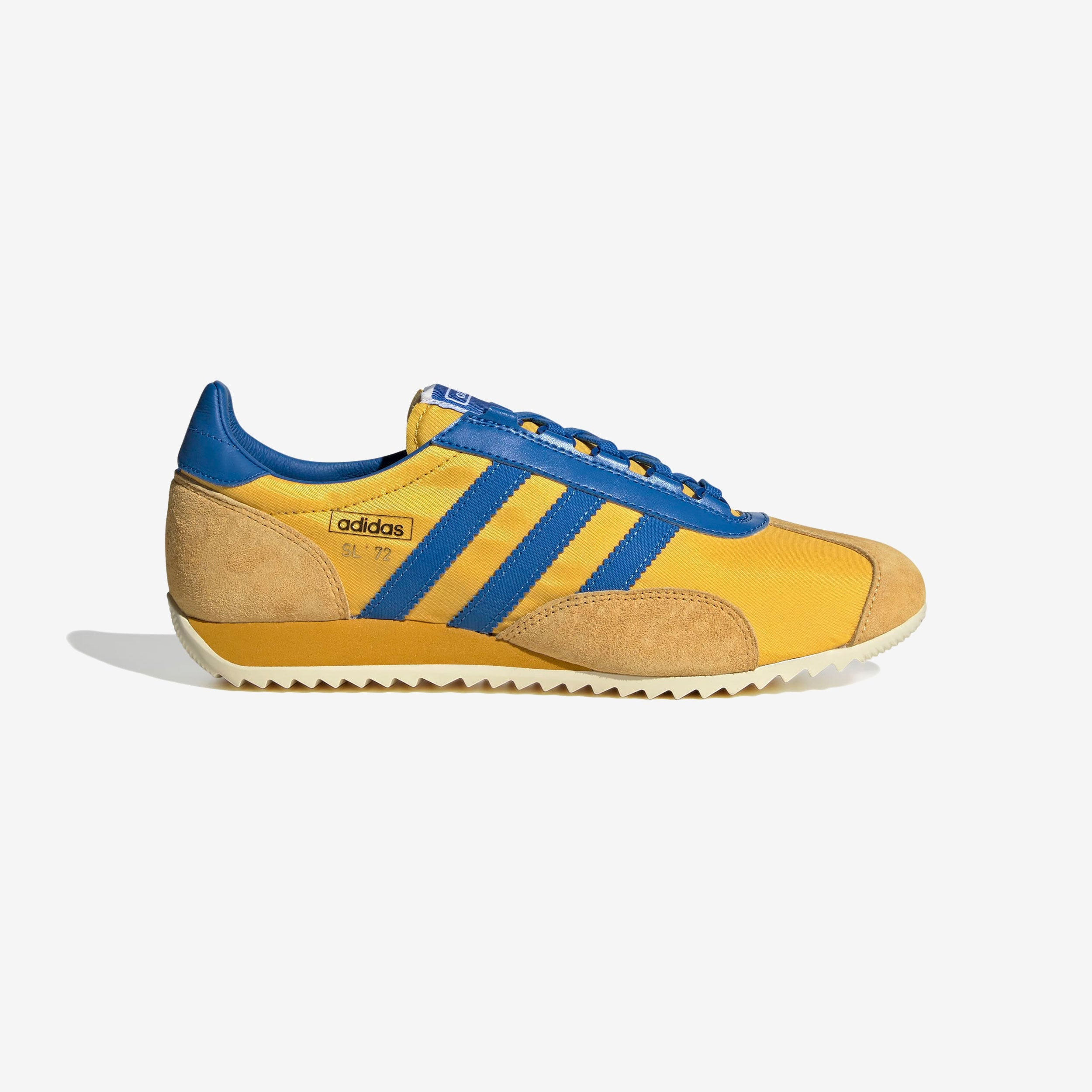 After first hitting the scene in 1972, the adidas SL 72 returns once again in two new colors, paying homage to the silhouette's rich history. Crafted with a plush nylon upper with smooth leather lining, this iconic pair features a cellular rubber heel wedge for impact absorption, while a grippy rubber outsole offers maximum grip wherever you step. Classic adidas branding hits the lateral sides and tongue label to finish the timeless design. - adidas SL 72 PT - Regular fit - Nylon upper - Leather lining - Lace closure - Rubber outsole Article no: JR3638 Gender: Unisex Color: bold gold/bright royal/team royal blue
