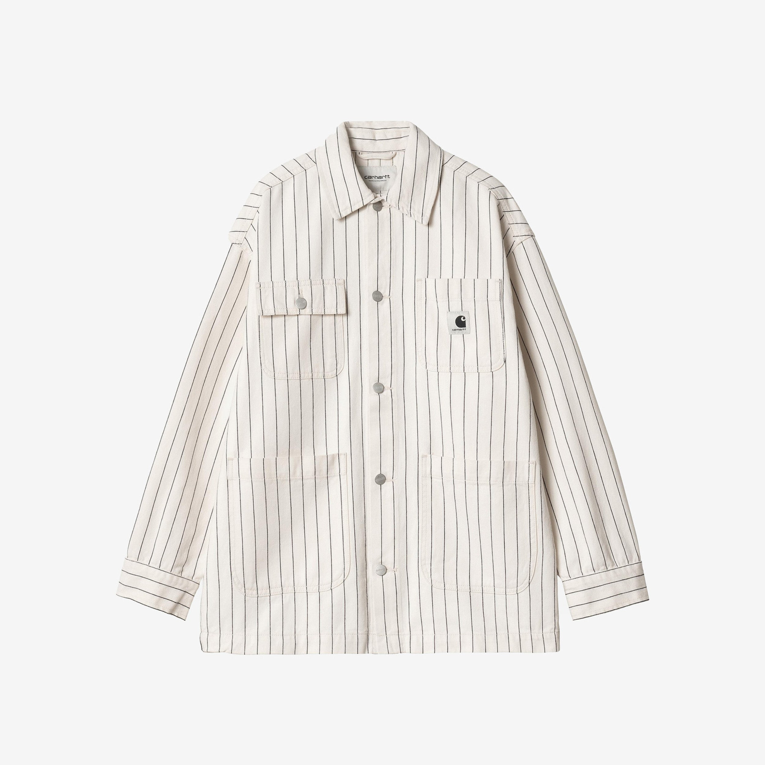 The perfect piece for the sunnier seasons, this women's Hendry Coat by Carhartt WIP is made from unlined, midweight cotton twill, offering a comfortable, breathable feel to your everyday adventures. Designed with allover stripes, this coat has four front pockets, one of which has a flap and button closure, and is finished with a signature woven Square Label on the left chest pocket. - Carhartt WIP Wmns Hendry Coat - 100% Cotton (Fountain twill) - Unlined - Buttoned front closure - Two chest pockets, one with flap and button closure - Two bottom patch pockets - Adjustable cuffs - Square Label Article no: I034847.2RM02 Gender: Women Color: Seaton Stripe, Wax / Dark Navy
