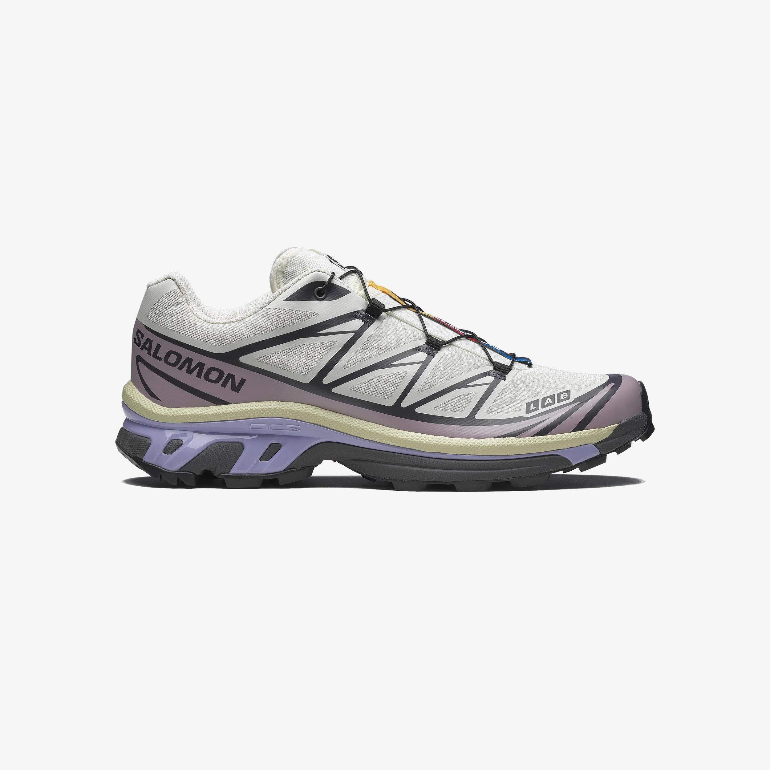 Few trail silhouettes have crossed into everyday rotation quite like the XT-6, a model that’s moved from ultra-distance running to becoming a clear favorite over the past few years. Built on Salomon’s agile trail platform, it combines a lightweight mesh upper with a stabilizing frame and quicklace system that keeps the fit precise without adding bulk. This version pairs a pale mesh base with muted lavender and soft yellow accents through the midsole and heel structure, while darker detailing grounds the outsole. It’s a technical shape that still feels surprisingly effortless once off the trail. - Salomon XT-6 - Lightweight mesh upper with synthetic overlays - Quicklace system with lace pocket - ACS chassis for stability and energy control - EVA midsole cushioning - Contagrip rubber outsole Article no: L47737600 Gender: Unisex Color: Icicle/Nirvana/Nine Iron