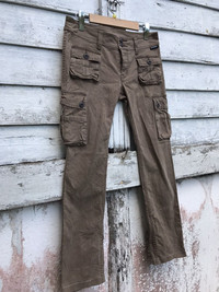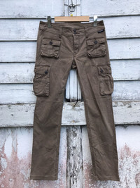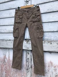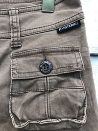 please read description below used item sold as it this item for skinny person doesnt fit for muscular bicep gym person size: S waist 29-30 inch stretch waist length /outseam 36 inch inseam 27 inch hip 35 inch thigh 18 inch knee 14 inch front rise 8 inch leg opening 6.5 inch brand: hysteric heavy Made: japan design:cargo material: cotton stretch condition: gently used Paypal only for business thanks