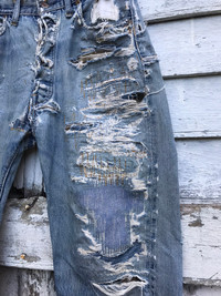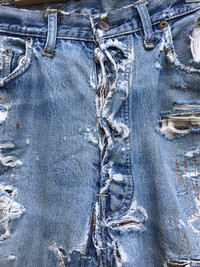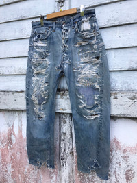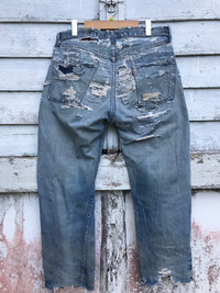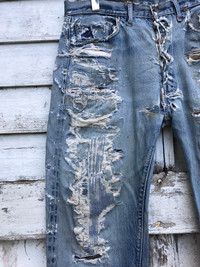 please read description below used item sold as it size: 34 waist 34 inch length / outseam 39 inch inseam 25 inch hip 42 inch thigh 24 inch knee 20 inch front rise 12 inch leg opening 8.5 inch brand:levis Made:usa design: reconstruct denim jean selvedge material: cotton condition: very worn very distressed Paypal only for business thanks
