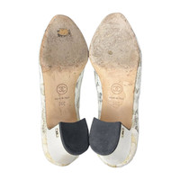 Era: Circa 2010s. Label: Chanel. Item: Mid-heel pumps. Size: IT36. Main color: White, black, and gold. Pattern: Floral lace. Features: Block mid-heels, leather soles, contrasting black toe caps on sheer white lace. Condition: There are yellowing glue stains due to storage and slight marks from wear on the fabric, mainly at the back of the heels. #Chanel #laceheels #blockheels #romantic