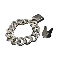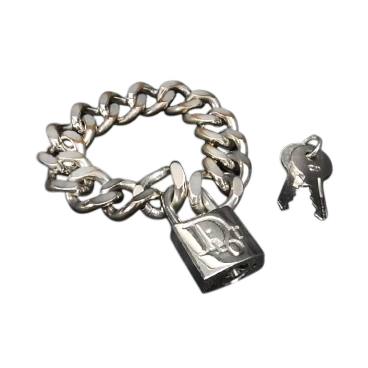 Era: Haute Couture S/S 2001. Label: Dior. Item: Chainlink bracelet with pendant. Size: Small (Chain length: 17.5cm; Pendant length: 3.5cm; Pendant width: 2cm) Main color: Silver. Pattern: - Features: Heavy curb chain link, working padlock with "Dior" engraved, fastens with two functional keys. Condition: There is more oxidation to one side of the bracelet and light scratches to the overall silver-tone plating; nothing obvious when worn.