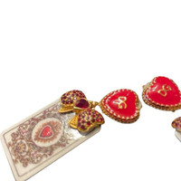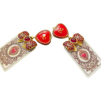 Era: S/S 2018. Label: DG. Item: Clip-back earrings. Size: Large. Main color: White, red, and gold. Pattern: Heart with bows and tarot playing cards. Features: Enamel heart, bows encrusted with dark red rhinestones, with tarot playing card pendant. Fastens with clip-backs. Condition: There are light scratches and wear to the gold plating. Yellowing to one ear pad. #DolceandGabbana #statementearrings #designer #hearts #jewelry
