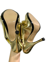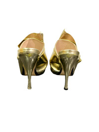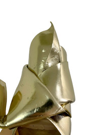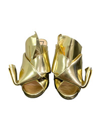 Era: S/S 2015. Label: N°21. Item: Metallic gold origami mule high heels Size: IT36. Main color: Gold. Pattern: - Features: Folded leather uppers, super high heels, leather outsoles and insoles. Condition: There are multiple scratches and scuffs to the leather, especially at the back and vamps. #NumeroVentuno #N21 #archivalfashion #designer #iconic #metallic #origami #knotted