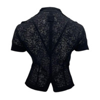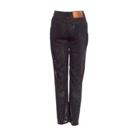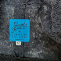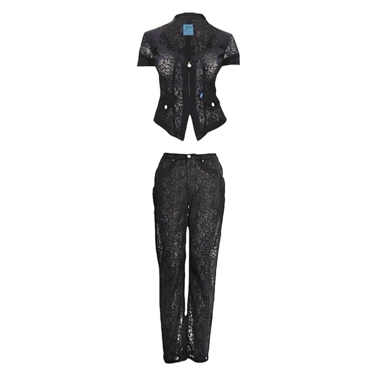 Era: 1990s. Label: Jeans de Christian Lacroix. Item: Zip-up short-sleeved top and jeans set. Top size: FR46 (Approximate measurements; width: 18 inches, length: 23 inches). Jeans size: 29 (Approximate measurements; hip: 36.5 inches, rise: 10.75 inches, inseam: 29 3/4 inches). Main color: Black. Pattern: Floral lace. Features: Top is fully-sheer with darts in front and back to create a corseted silhouette when worn, fastens with hidden front zipper with two decorative pockets in the front near the waist. Jeans has nude shorts lining the crotch area but is mostly sheer, fastens with a front zipper and fly button, has slit pockets in front and patch pockets at the back with rivets. Fabric on both has stretch. Condition: There is wear to the overall fabric and light scratches to the hardware from age and storage.