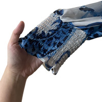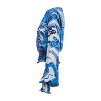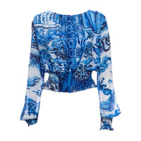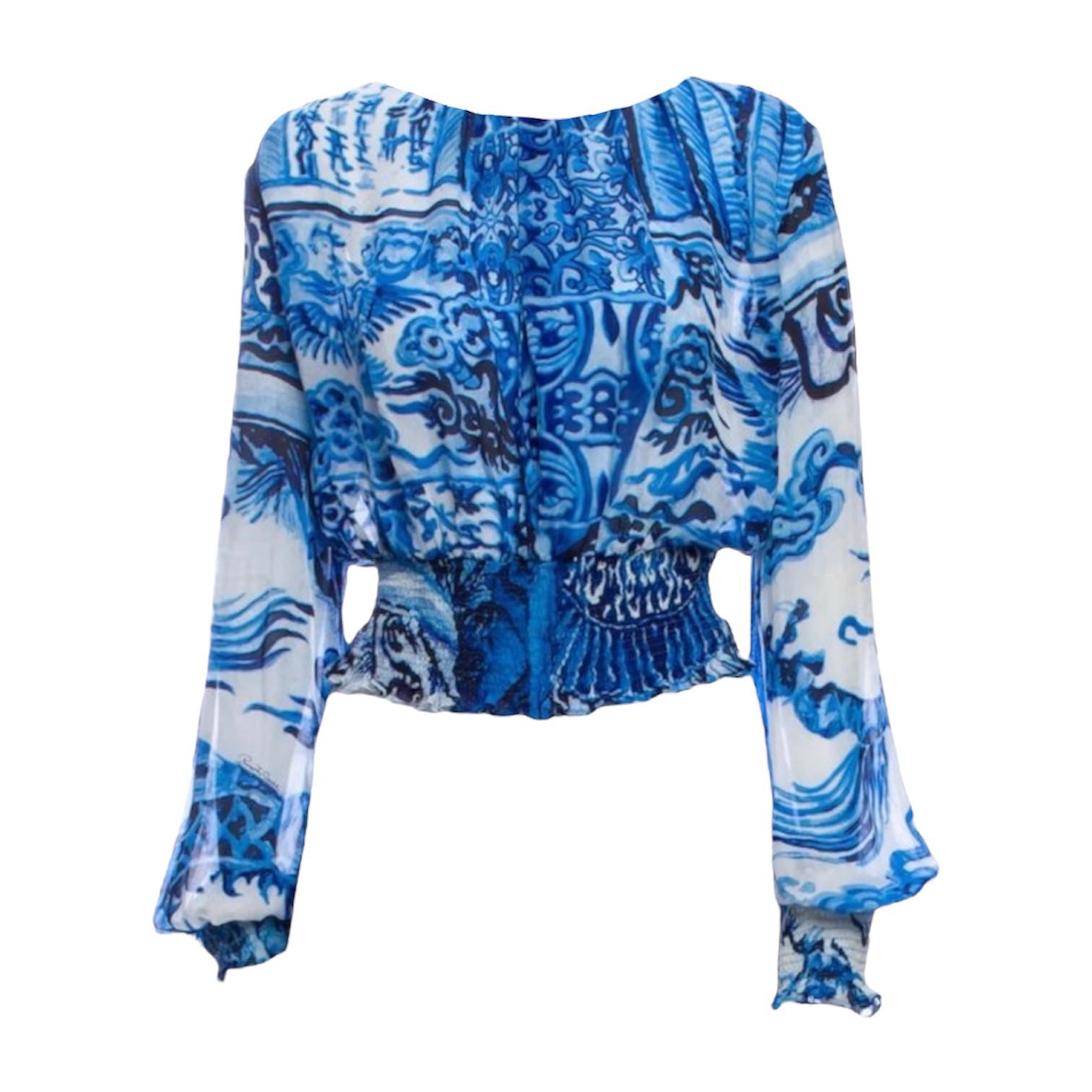 Era: F/W 2005. Label: Roberto Cavalli. Item: Dragon porcelain print silk blouse. Size: IT42. Main color: Blue and white. Pattern: Ming dragon porcelain print. Features: Crew neckline, elasticized cuffs and waist, corseted details at waist area, balloon sleeves, slit in the center, slightly sheer fabric. Can be worn both ways, front and back. Condition: There is wear to the overall fabric. Elastics have loosened a little due to age. #RobertoCavalli #silkblouse #porcelain #iconic #vintage
