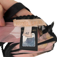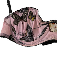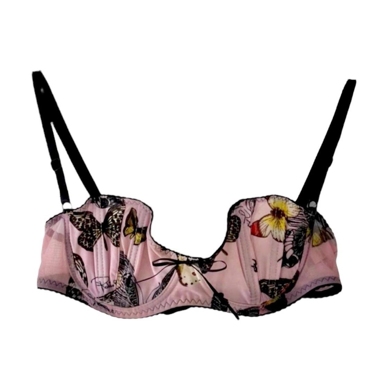 Era: Circa 2000s. Label: Roberto Cavalli. Item: Wired balconette bra. Size: IT42. Main color: Pink and black. Pattern: Butterfly-print. Features: Boning inside the cups, cups are lightly-lined, mesh bands are sightly sheer, adjustable straps, fastens with hook and eye closure at the back. Condition: There is wear to the label. #RobertoCavalli #archival #butterflyprint #vintage