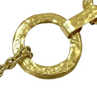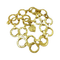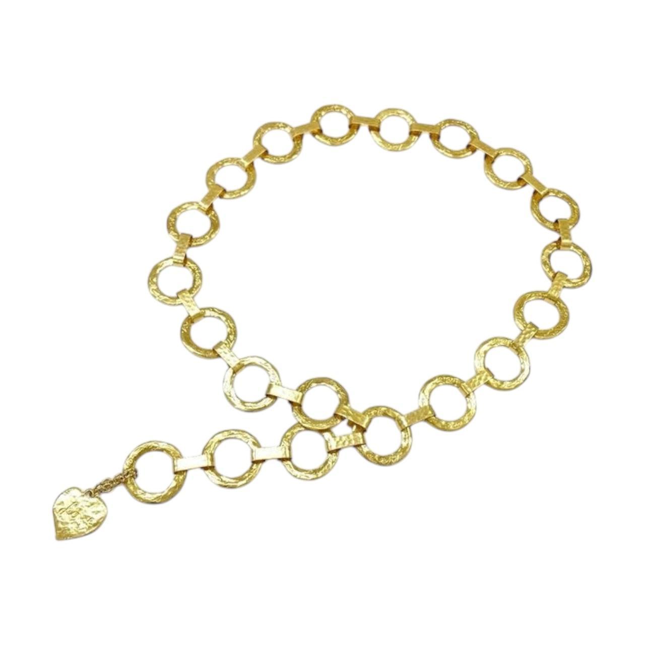Era: Circa 1980s. Label: Yves Saint Laurent. Item: Hammered chain link belt with “Love” heart charm. Size: Free size. Main color: Gold. Pattern: Hammered. Features: Hammered gold-plated chain link belt with “Yves Saint Laurent” in cursive on the hoops, ending with a heart charm with “Love” in cursive on it. Fastens with a hook closure. Condition: There is light wear to the overall gold plating. #chain #YvesSaintLaurent #vintage #archival