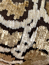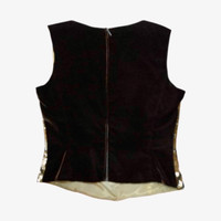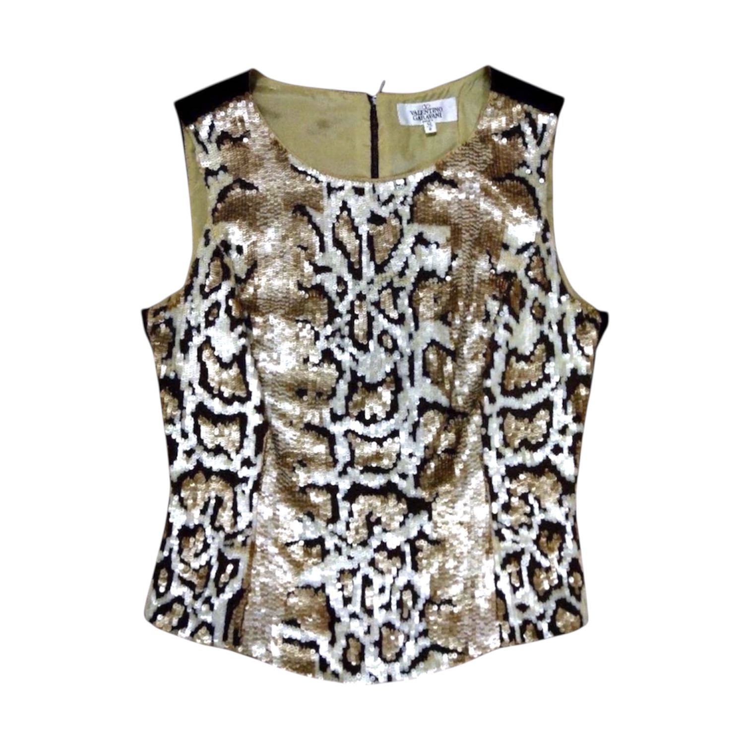 Era: Circa 1990s. Label: Valentino Garavani Miss V. Item: Sequined leopard tank top. Size: IT42. Main color: Beige, brown, and black. Pattern: Leopard print. Features: Fully-embellished front, dark brown velvet back, sleeveless. Condition: There is light wear throughout the garment. #vintage #Valentino #embellished #tanktop #leopardprint