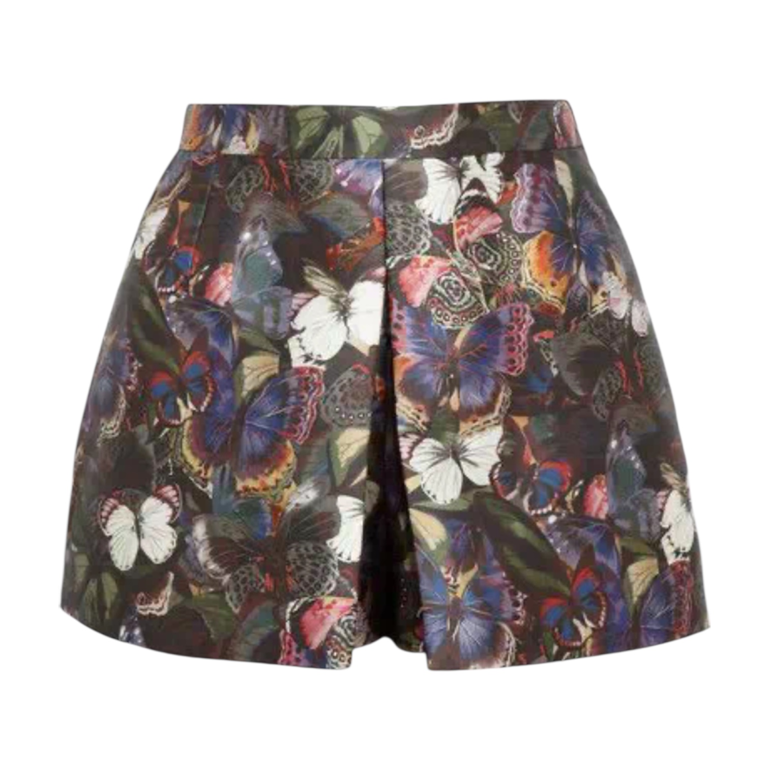 Era: Pre-Fall 2014 by Maria Grazia Chiuri and Pierpaolo Piccioli. Label: Valentino. Item: Camubutterfly shorts. Size: IT40. Main color: Multicolor. Pattern: Butterfly print. Features: High-waisted, fastens with hidden zipper at the side with hook closure. Condition: There is light wear to the overall fabric.