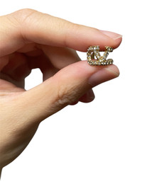 Era: 2020s. Label: Valentino. Item: Ear cuff. Size: Small (about 1cm in diameter). Main color: Clear and gold. Pattern: - Features: Crystal rhinestone embellishments on gold-plated brass metal. Condition: Wear to the gold finish on the inside, not visible when worn. #Valentino #designer #iconic #earcuff #daintyjewelry #rhinestoneearcuff