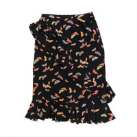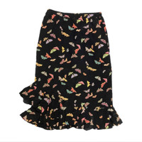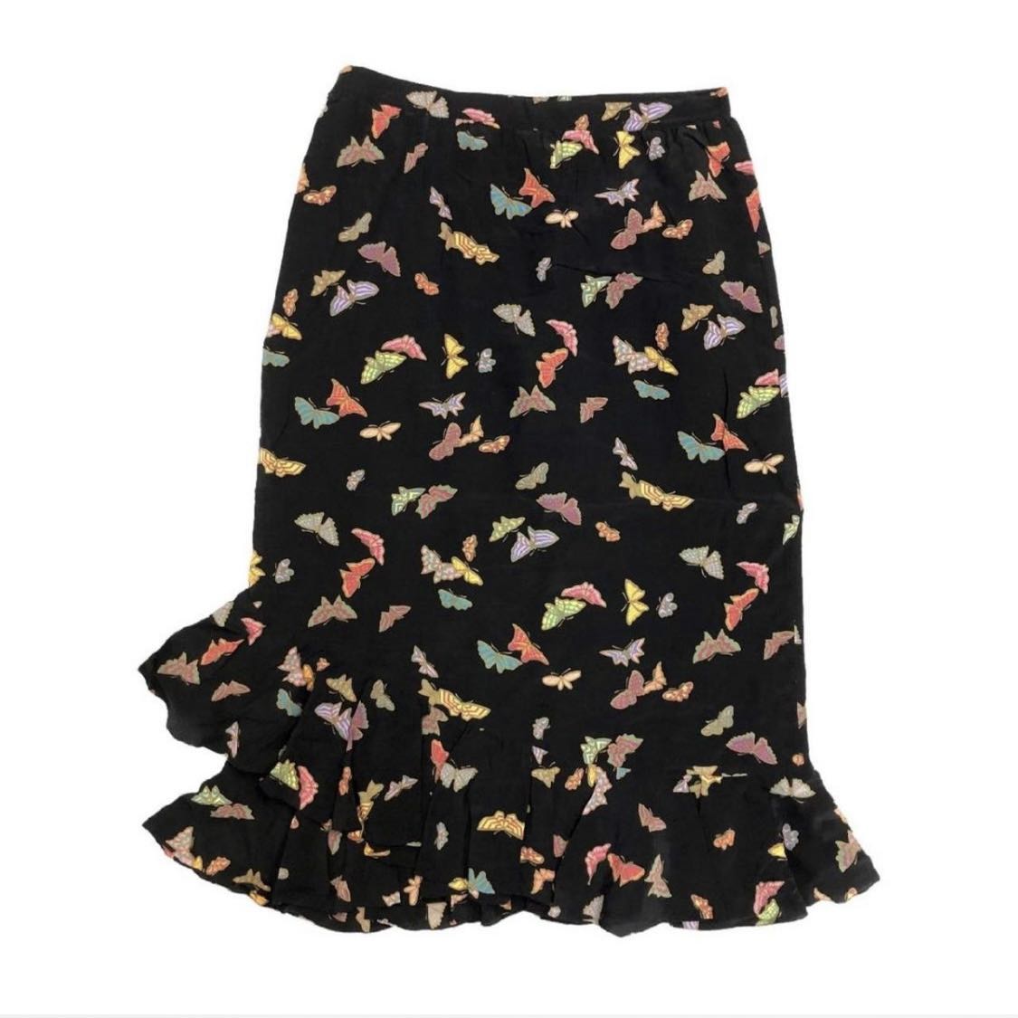 Era: 1980s. Label: Valentino Boutique. Item: Midi skirt. Size: US6; fits up to S. Main color: Multicolor and black. Pattern: Butterfly print. Features: Ruffle trims across the front, lower back, and hem. Condition: No noteworthy issues. #vintage #Valentino #archivalfashion #designer #iconic #80s #butterflyprint #ruffles #silkskirt