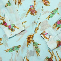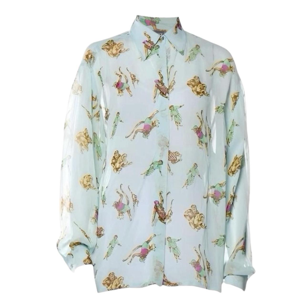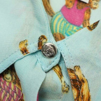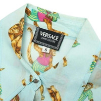Era: Circa 1990s. Label: Versace Jeans Couture. Item: Monkey print semi-sheer chiffon long sleeve shirt. Size: S. Main color: Brown, blue, green and pink. Pattern: Anthropomorphic monkey print Features: Pointed collar, semi-sheer fabric, long sleeves, single silver-tone Medusa button at both sleeve cuffs and at the top center, fastens with hidden functional buttons down the front. Condition: There is light wear to the overall fabric. #GianniVersace #vintage #archival