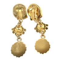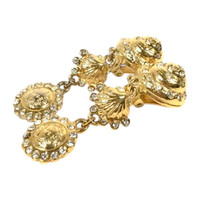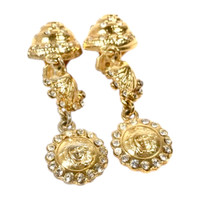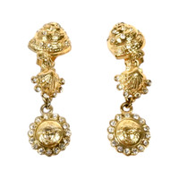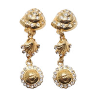 Era: S/S 1992. Label: Gianni Versace. Item: Clip-back earrings. Size: Medium. Main color: Gold. Pattern: Seashells and Medusa. Features: Seashells and Medusa medallion in polished gold finish, adorned with crystal rhinestones. Condition: There are light scratches and wear to the gold plating. #archival #vintage #designer #statementearrings #summer