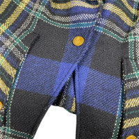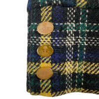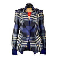 Era: Circa 1993. Label: Vivienne Westwood. Item: Military jacket. Size: IT42. Main color: Yellow, green, blue, and black. Pattern: Tartan. Features: Has epaulettes, fastens with single orb-engraved button in front, has 3 orb-engraved buttons on each cuff. Condition: There are sticker stains near the designer label as pictured, and light wear to the overall fabric from age and storage. #viviennewestwood #military #tartan #plaid #vintagejacket