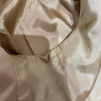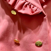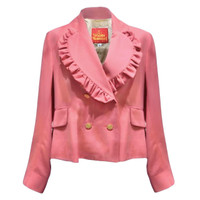 Era: S/S 1985. Label: Vivienne Westwood. Item: Oversized jacket with frilly oversized collars. Size: IT42. Main color: Pink and gold. Pattern: - Features: Fully-lined inside, long sleeves, rounded collar with frills at the edges, has two decorative gold buttons in front, has an inner functional button, fastens with two functional gold buttons in front. Condition: There are light signs of wear to the overall fabric with sticker stains near the label and in the inner lower section; not visible when worn. #VivienneWestwood #vintage #archival