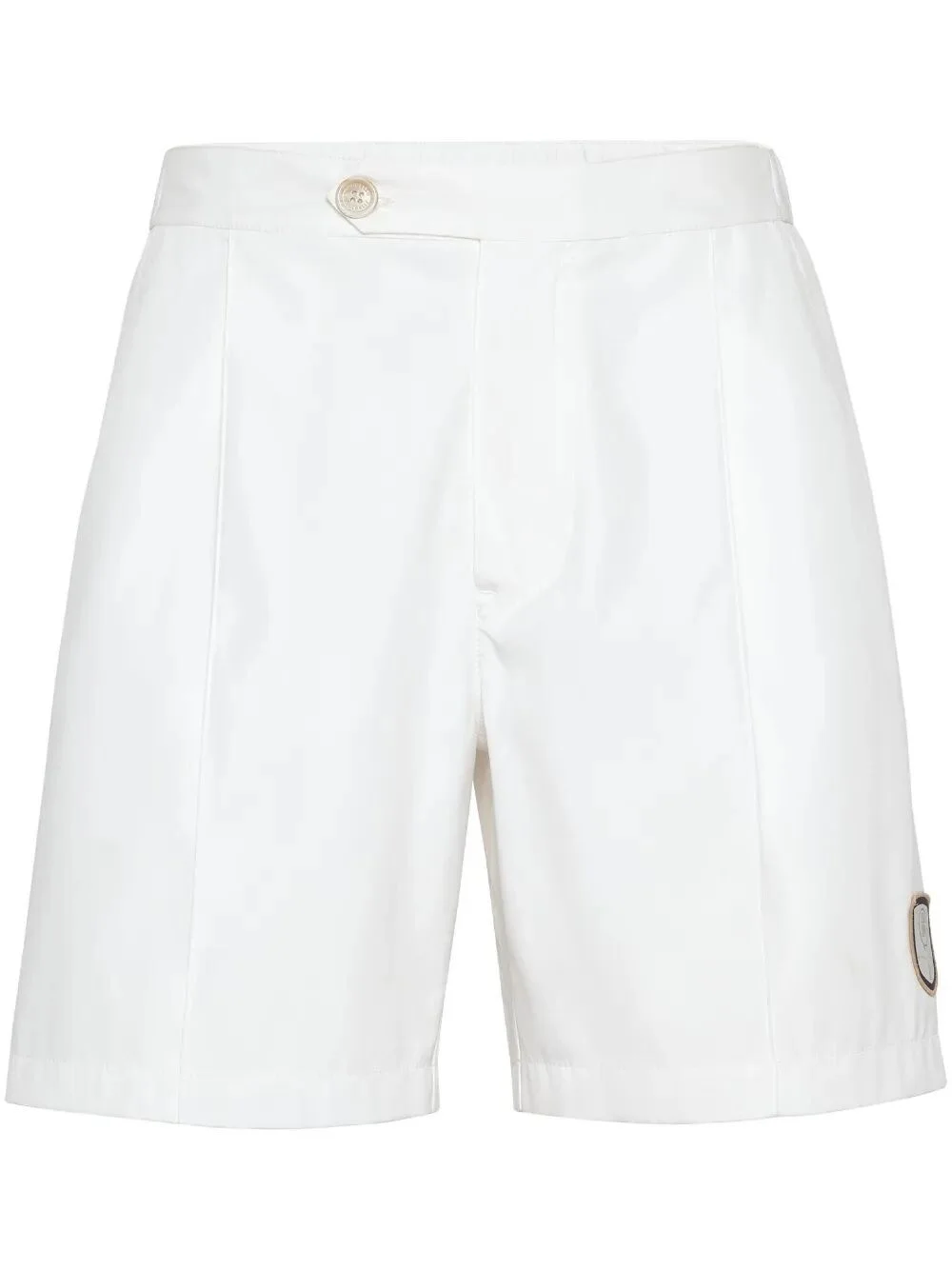 Bonded nylon pleated Bermuda shorts with tabbed waistband and tennis badge