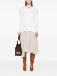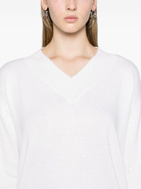 Composition: Cashmere Made In: Italy|IT Cashmere-silk blend knitted fabric with sequin embellishments, ribbed edges, V-neck, drop shoulder design, long sleeves, and a straight hem. PRODUCT INFO: Product code M73539922 CJ159 BIANCO 80%Ws 20%Se