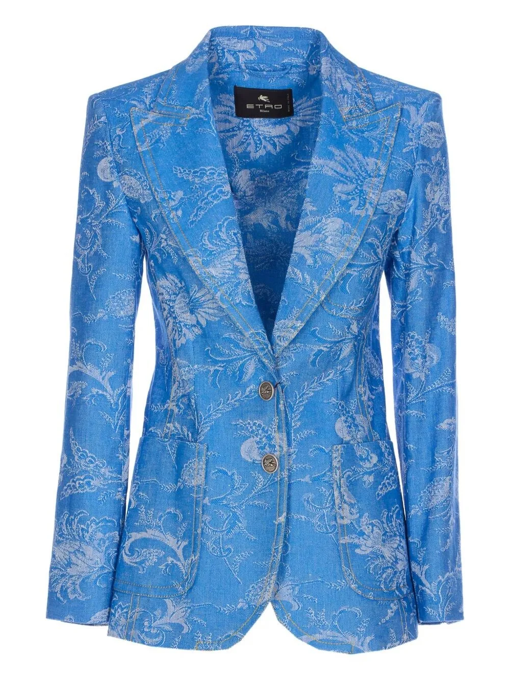 SINGLE-BREASTED COTTON AND LINEN JACQUARD DENIM JACKET WITH FLORAL MOTIF
