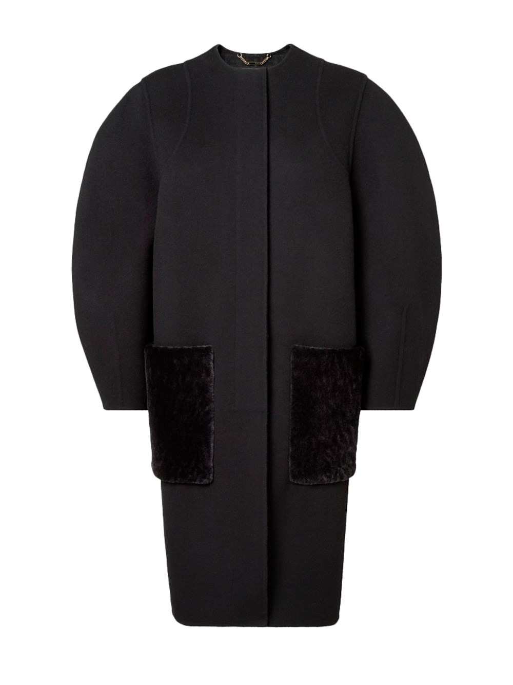 Composition: Wool Made In: Italy|IT Single-breasted midi coat. Cocoon-style design with wide long sleeves and a crew neck. Concealed front closure. Made of black double wool fabric. The interior is personalized with a gray FF motif. Finished with tone-on-tone sheepskin patch pockets. Made in Italy PRODUCT INFO: Product code FF6165A5HD F1FL8 BLACK/GREY 99%Wv 1%Se