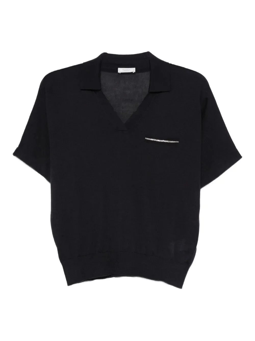 Composition: Cashmere Made In: Italy|IT Blue V-neck short-sleeve top made from a cashmere-silk blend with a rhinestone-adorned chest pocket and ribbed hem. PRODUCT INFO: Product code A99294F18K09282 061 INCHIOSTRO 70%Ws 30%Se