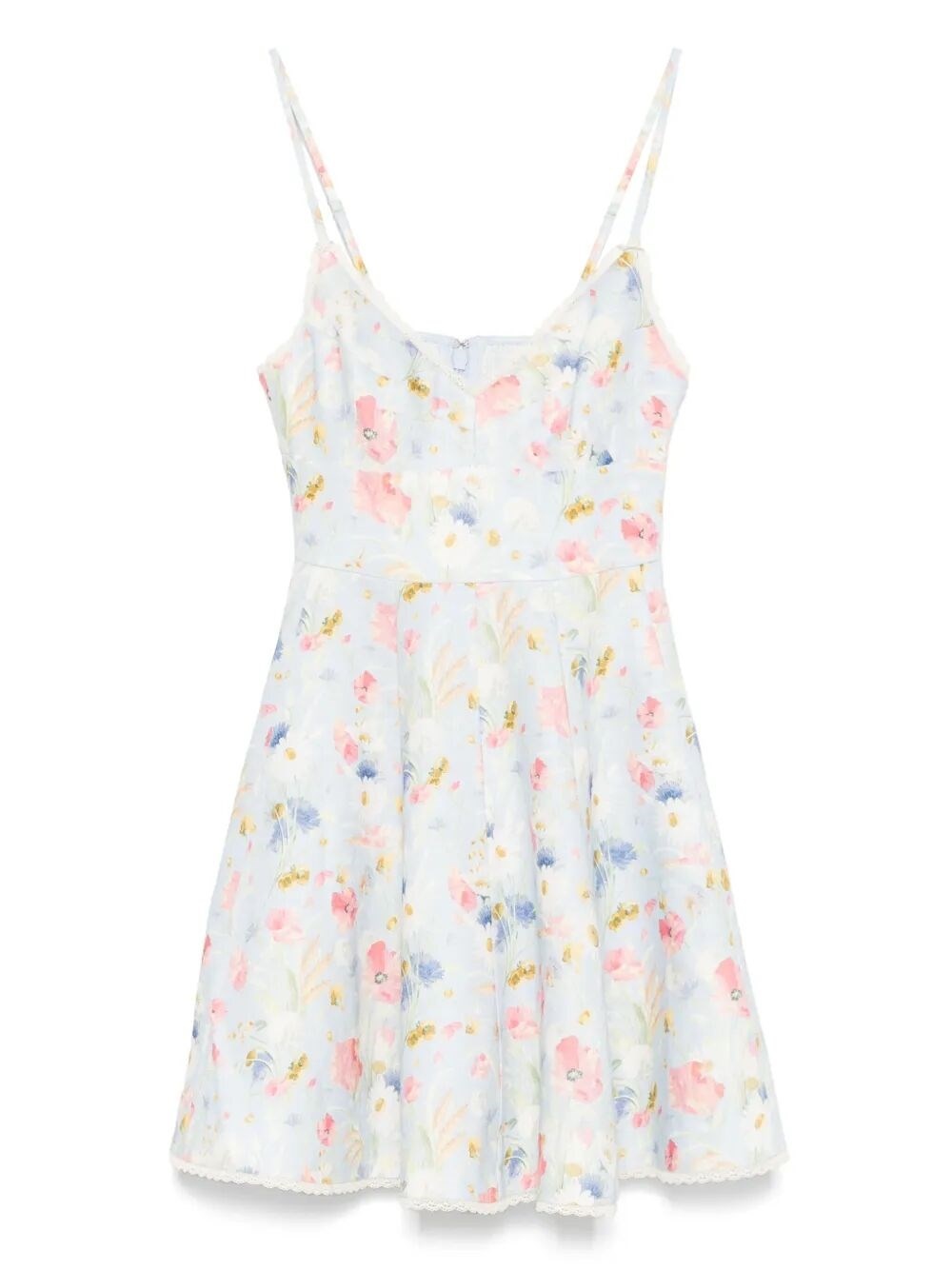 Lucky lace-trimmed floral-print linen mini dress Light blue