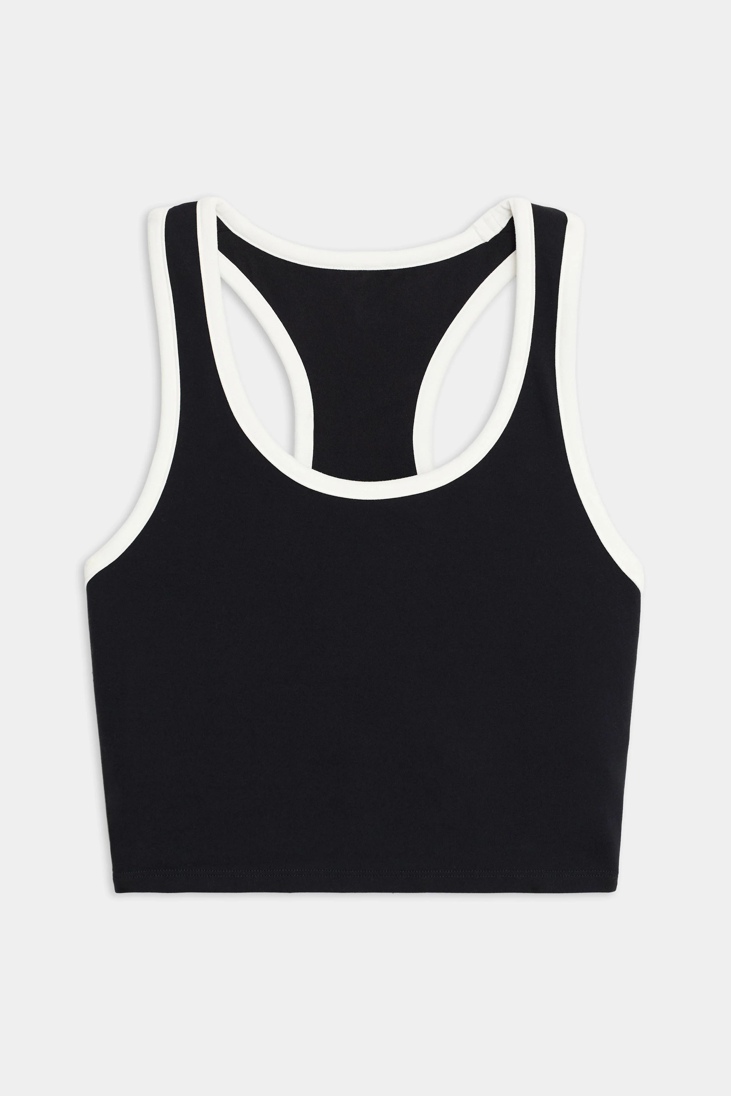Sophisticated crisp white trim provides a chic touch to this cropped scoop-neck. The super soft ultra luxe Airweight performance fabric gives you superior second skin comfort and freedom. BEST FOR: hot yoga, barre, pilates. Model is H: 5’10” Bust 32 Waist 23.5 Hips 34.5” and wearing a size small THE FIT AIRWEIGHT: 81% nylon/ 19% spandex Moisture-wicking & Quick-dry technology.