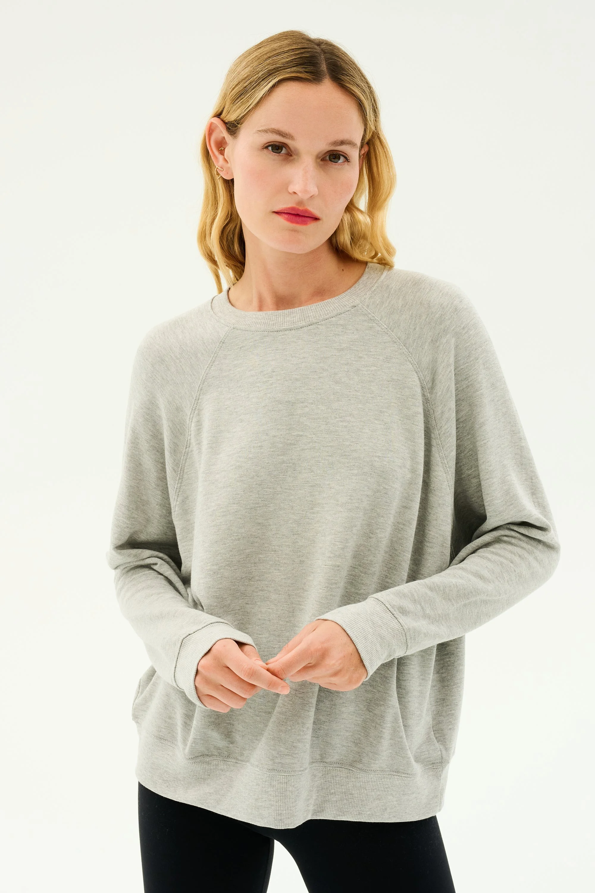 This crewneck pullover is a throw back to the classic college sweatshirt. Indulgent and sporty, with raglan sleeves and ribbed hem and cuffs. The feminine drape stretch modal fabric is soft, versatile and ultra-flattering. MADE IN LOS ANGELES to minimize our carbon footprint. BEST FOR: Warming up and cooling down after running, yoga, CrossFit, barre, Pilates, cycling and spin class. Model Stats: Height: 5’10”, Bust: 32", Waist: 23.5”, Hips: 34.5” Wearing size: Small THE FIT LUXE FLEECE: 95% Modal/ 5% spandex The finest TENCEL™ Modal fibers are produced with Micro technology for a softer touch. And made with at least 50% less carbon emissions and water consumption. Ultra luxe fleece