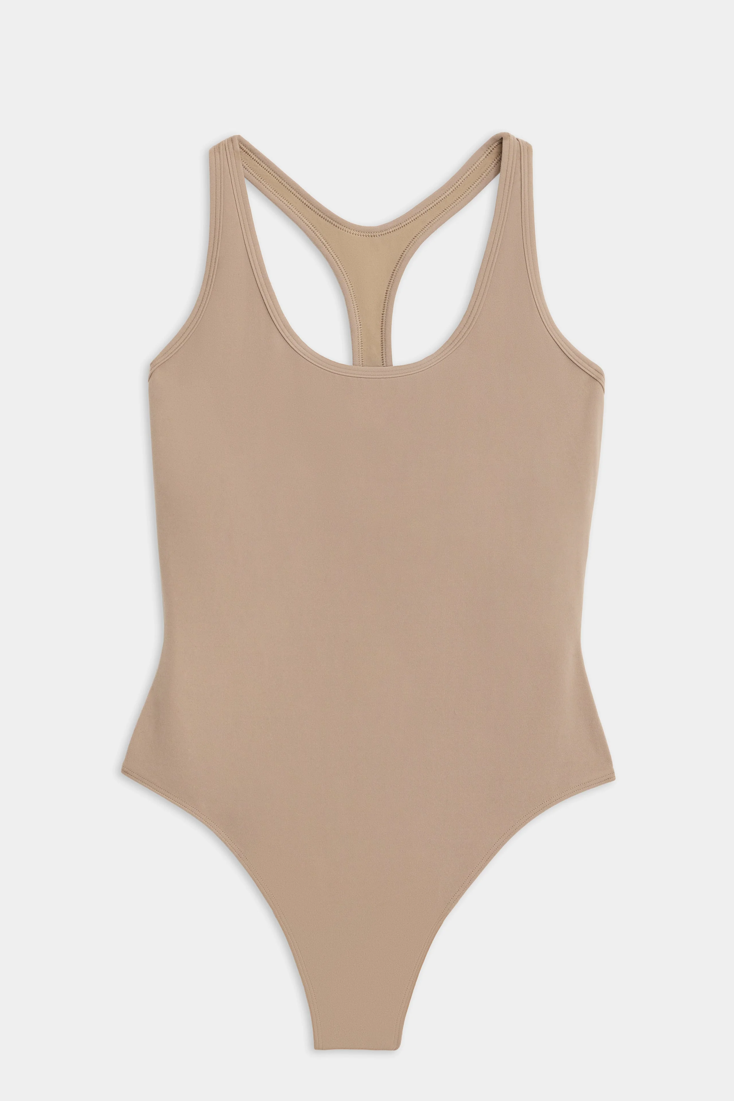 Slip into our supremely soft bodysuit featuring a racerback, scoop neckline and no show thong. Perfect to layer with your favorite sweatpants and leggings. BEST FOR: hot yoga, barre, Pilates. THE FIT AIRWEIGHT: 81% nylon/ 19% spandex Moisture-wicking & Quick-dry technology.