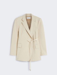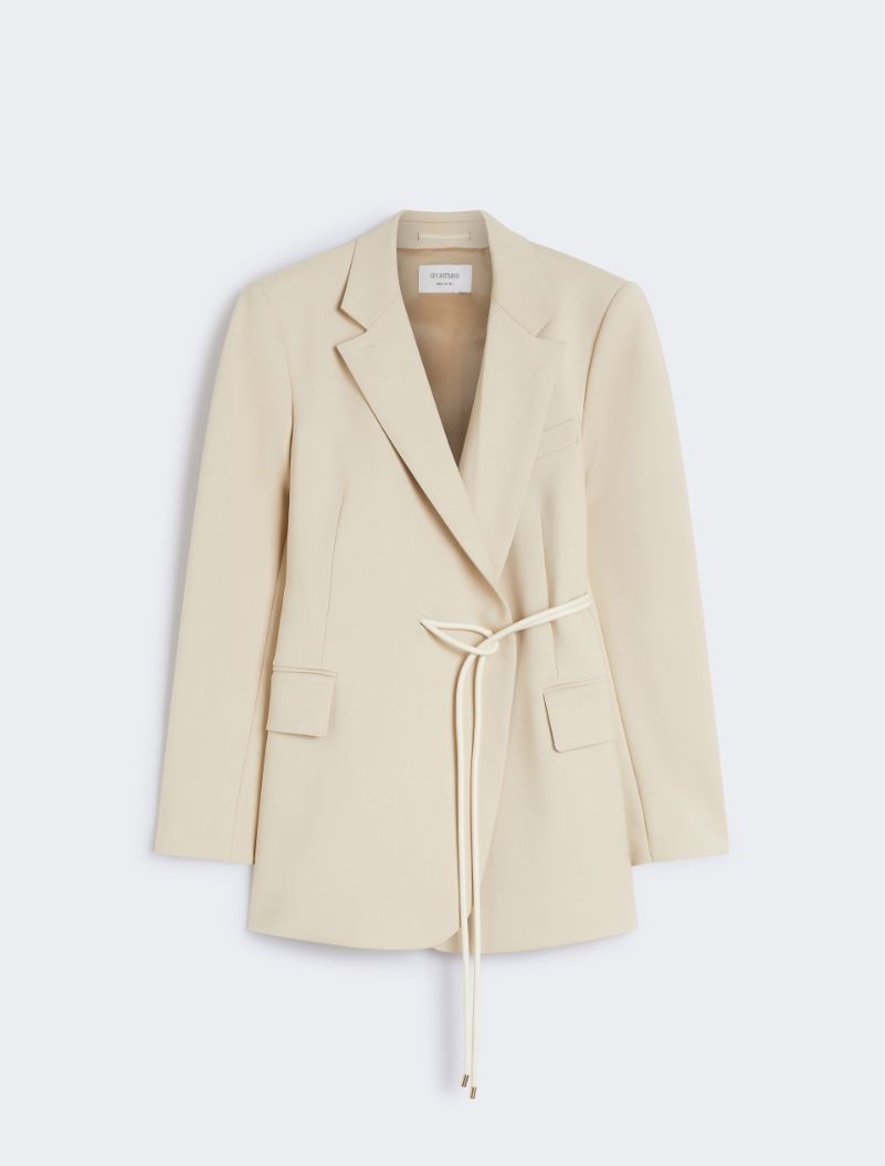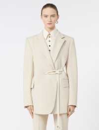 Tailored blazer with double-breasted construction, with a highlighted waist. The special construction with internal belt passage on the right side creates a play of asymmetries. - Blazer in double stretch viscose canvas with belt and internal lining - Regular fit - Lapel neckline - Tubular belt - Side pockets with double welt and flap - Wide fit Composition and Care Jacket fabric 97% viscose, 3% elastane; lining 70% acetate, 30% polyester; sleeves lining 97% viscose, 3% acetate; with belt in polyester with polyurethane coating. Jacket: do not wash; do not bleach; do not tumble dry; cool iron; professionally dry clean perchloroethylene - mild process; do not wet clean.; Put this item into a string bag before washing it. Belt: do not wash; do not bleach; do not tumble dry; do not iron; do not dry clean; do not wet clean. Distributed by Max Mara S.r.l., registered office in Reggio Emilia (Italy), Via Giulia Maramotti 4, 42124