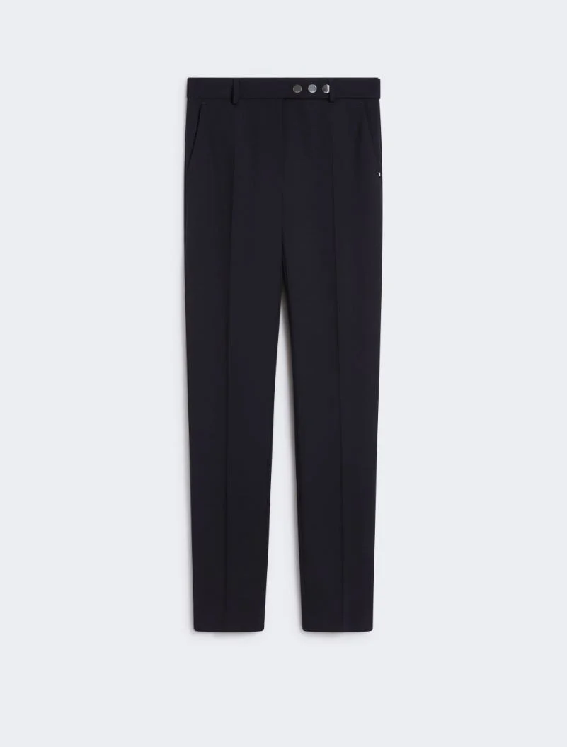 Cigarette trousers in soft stretch wool, with zipped slit at the ankle that accentuates the leg’s slender line. The long flap at the waist falls freely at the front. - Natural stretch pure wool trousers - Cigarette fit with slightly low waist - Closure with custom snap buttons and long flap with belt effect - Customised waistband interior - Trouser crease on front and back with zipped ankle slit at the back - Slant side pockets and back welt pockets - Regular fit Composition and Care 100% virgin wool. Do not wash; do not bleach; do not tumble dry; cool iron; professionally dry clean perchloroethylene - mild process; do not wet clean. Distributed by Max Mara S.r.l., registered office in Reggio Emilia (Italy), Via Giulia Maramotti 4, 42124