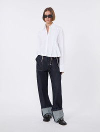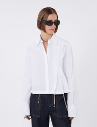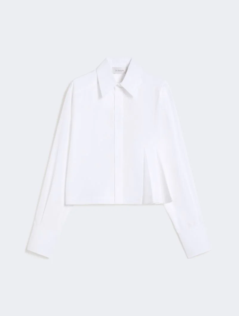 Pure cotton poplin shirt with a cropped silhouette for a modern, on-trend look. Decorated with a double asymmetricalpleat on the left side, which adds movement. - Pure cotton poplin shirt - Straight cut with cropped line - Shirt collar - Concealed buttoning - Double pleat motif on the left - Regular fit Composition and Care 100% cotton. Machine wash cold delicate cycle; do not bleach; do not tumble dry; line drying in the shade; cool iron; professionally dry clean perchloroethylene - mild process. Distributed by Max Mara S.r.l., registered office in Reggio Emilia (Italy), Via Giulia Maramotti 4, 42124