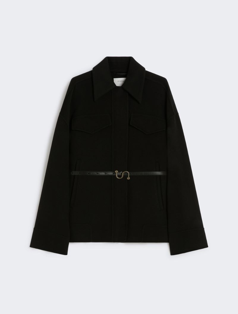 Bomber inspiration for this pea coat in soft double wool. Model with thin belt in real leather and gold metal S-buckle. - Double pure-wool drap pea coat. - Regular fit - Shirt collar with concealed zip fastening - Dropped shoulder with long shirt sleeve - Inset pockets with shaped flap and leather belt with S-buckle - Regular fit Composition and Care Short coat fabric 100% virgin wool; - except joining thread; with belt in cattle. Short coat: do not wash; do not bleach; do not tumble dry; cool iron; professionally dry clean perchloroethylene - mild process; do not wet clean. Belt: do not wash; do not bleach; do not tumble dry; do not iron; do not dry clean; do not wet clean. Distributed by Max Mara S.r.l., registered office in Reggio Emilia (Italy), Via Giulia Maramotti 4, 42124