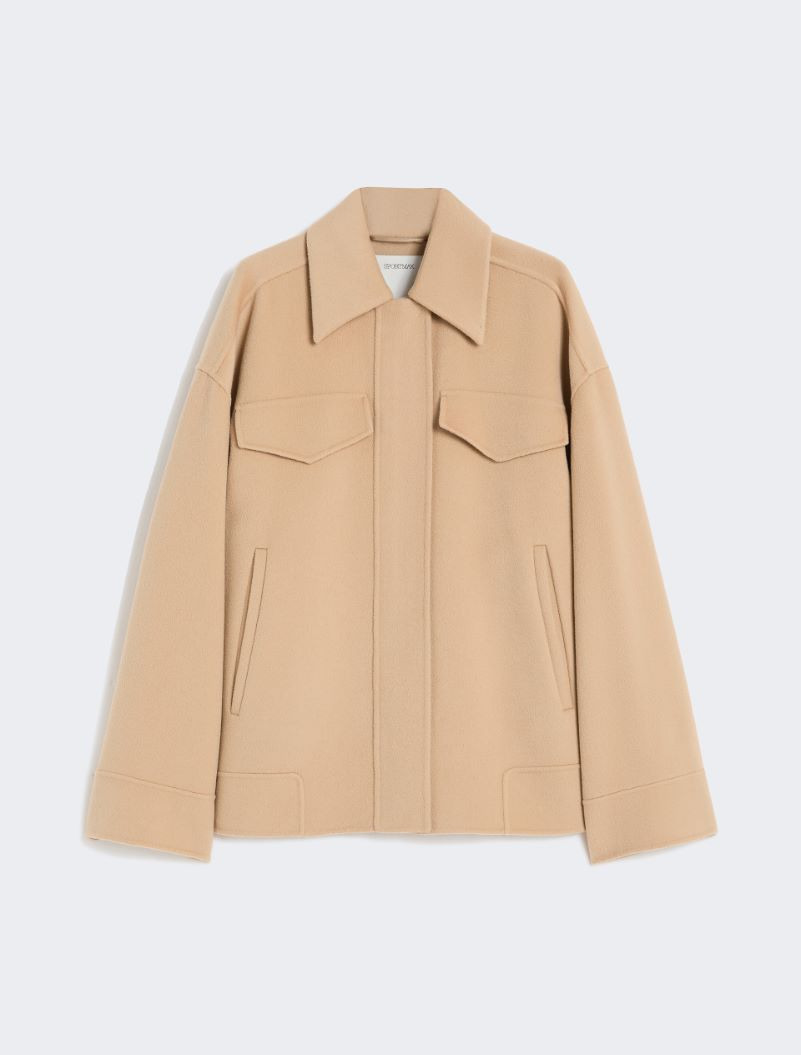 Bomber inspiration for this pea coat in soft double wool. Model with thin belt in real leather and gold metal S-buckle. - Double pure-wool drap pea coat. - Regular fit - Shirt collar with concealed zip fastening - Dropped shoulder with long shirt sleeve - Inset pockets with shaped flap and leather belt with S-buckle - Regular fit Composition and Care Short coat fabric 100% virgin wool; - except joining thread; with belt in cattle. Short coat: do not wash; do not bleach; do not tumble dry; cool iron; professionally dry clean perchloroethylene - mild process; do not wet clean. Belt: do not wash; do not bleach; do not tumble dry; do not iron; do not dry clean; do not wet clean. Distributed by Max Mara S.r.l., registered office in Reggio Emilia (Italy), Via Giulia Maramotti 4, 42124