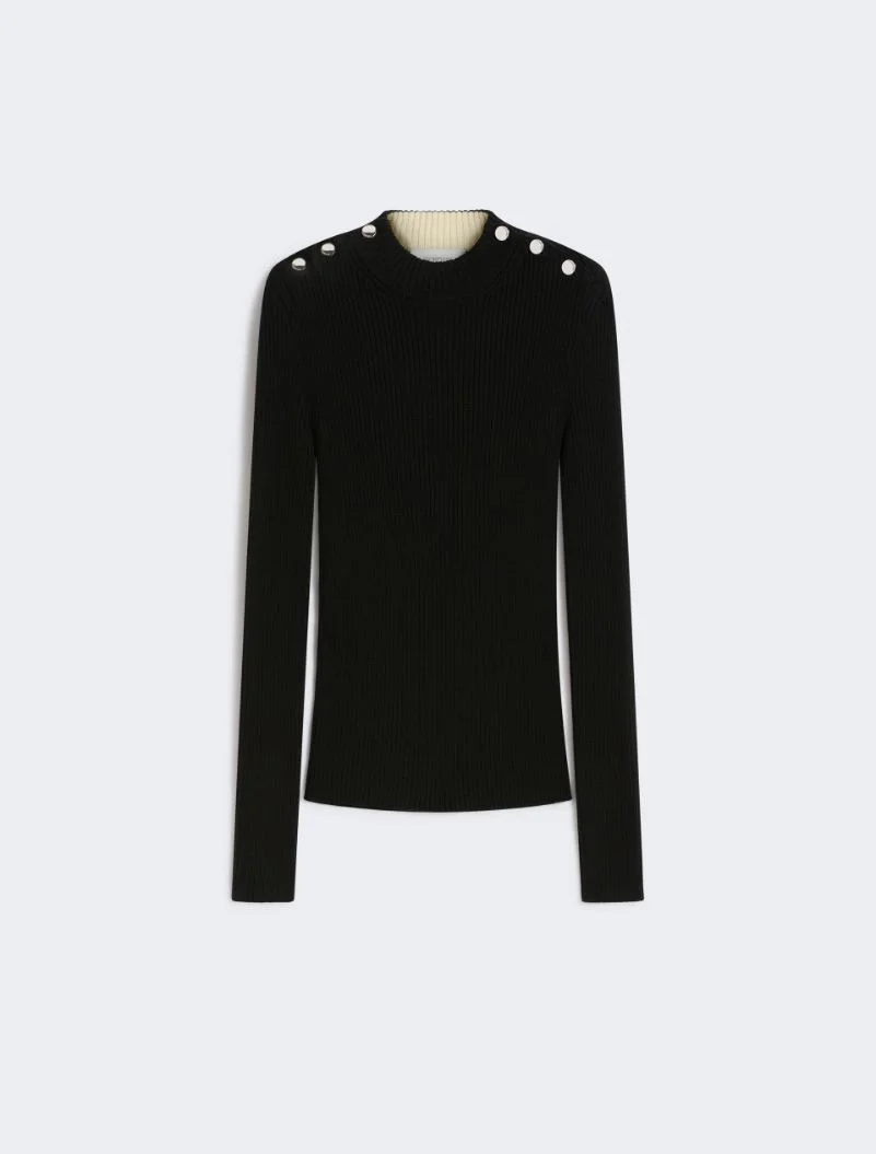Pure wool ribbed knit jumper with distinctively refined appearance and metal buttons on the shoulder and sleeve ends. - Pure wool rib-knit jumper - Fitted - Rounded neckline - Custom metal button motif on shoulders and along the sleeves - Regular fit Composition and Care 100% virgin wool. Hand wash cold (40°c max); do not bleach; do not tumble dry; flat drying in the shade; cool iron; professionally dry clean perchloroethylene - mild process; do not wet clean.; iron with a cloth between.; using neutral detergent.; protect buttons before washing. Distributed by Max Mara S.r.l., registered office in Reggio Emilia (Italy), Via Giulia Maramotti 4, 42124