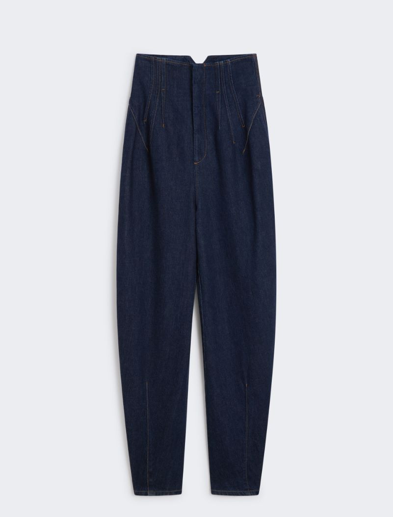 A very high waist and a play of contrasting volumes define these dark denim trousers. The deep darts at the waist create a feminine silhouette, with a flowing carrot-line leg. - Soft, dark clean indigo denim trousers, garment-treated for a dark, clean effect. - Fitted at the waist and with a wide carrot leg that tightens at the hem - Concealed zip fastening and high darts at the waist and ankle - In-seam side pockets and back patch pockets. - Contrasting stitching with tobacco thread and S-rivet on the left back pocket - Wide fit Composition and Care 100% cotton. Machine wash cold delicate cycle; do not bleach; do not tumble dry; line drying in the shade; cool iron; professionally dry clean perchloroethylene - mild process.; take care when wearing light-coloured clothes or accessories because, with the heat of the body, the indigo fabric , may fade and stain. be careful while sitting on light coloured surfaces, especially if wet. wash garments separately and always turned inside out. hang the garment turned inside out by avoiding to expose it to direct sunlight. avoid removing isolated stains. Distributed by Max Mara S.r.l., registered office in Reggio Emilia (Italy), Via Giulia Maramotti 4, 42124