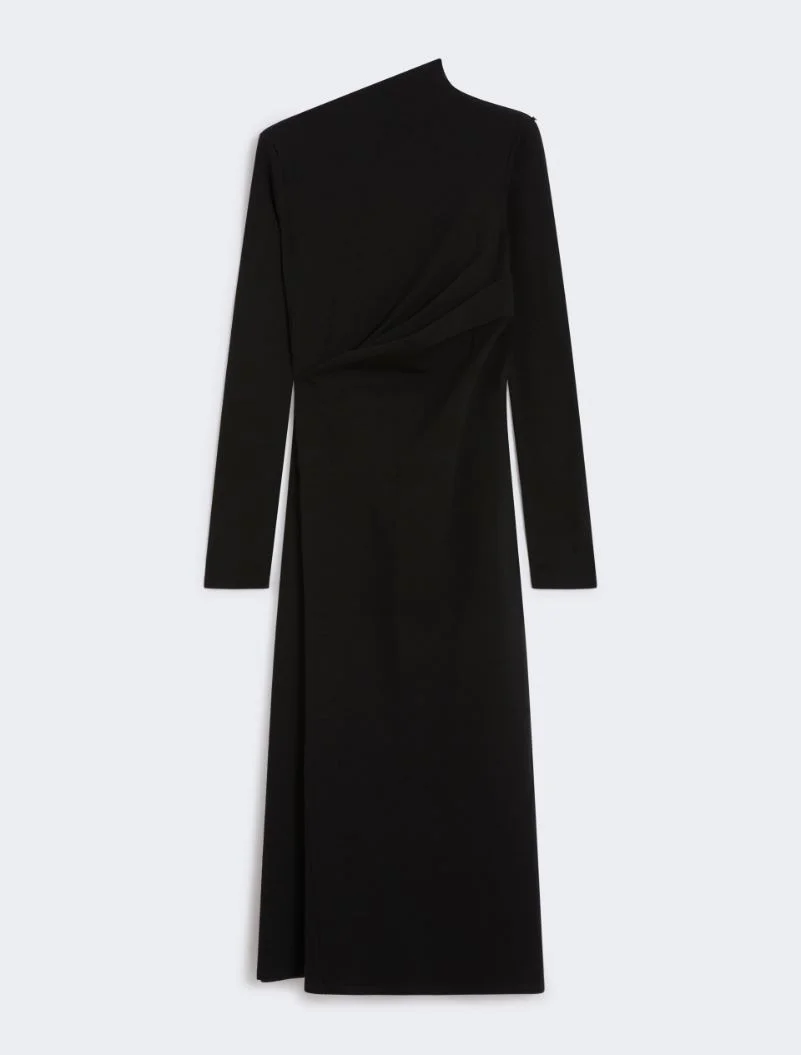 Flowing jersey dress with a feminine silhouette, featuring soft draping at the bust and a flared skirt enhanced by an asymmetrical panel that adds volume to the right side. - Flowing wool-blend jersey dress - Unstructured fit - Asymmetrical neckline with draping towards the right shoulder - Draped pleats at hip height - Flared skirt with a wedge of fabric on the right side - Fitted Composition and Care 48% wool, 45% cotton, 7% polyamide. Do not wash; do not bleach; do not tumble dry; cool iron; professionally dry clean perchloroethylene - mild process; do not wet clean.; iron with a cloth between. Distributed by Max Mara S.r.l., registered office in Reggio Emilia (Italy), Via Giulia Maramotti 4, 42124